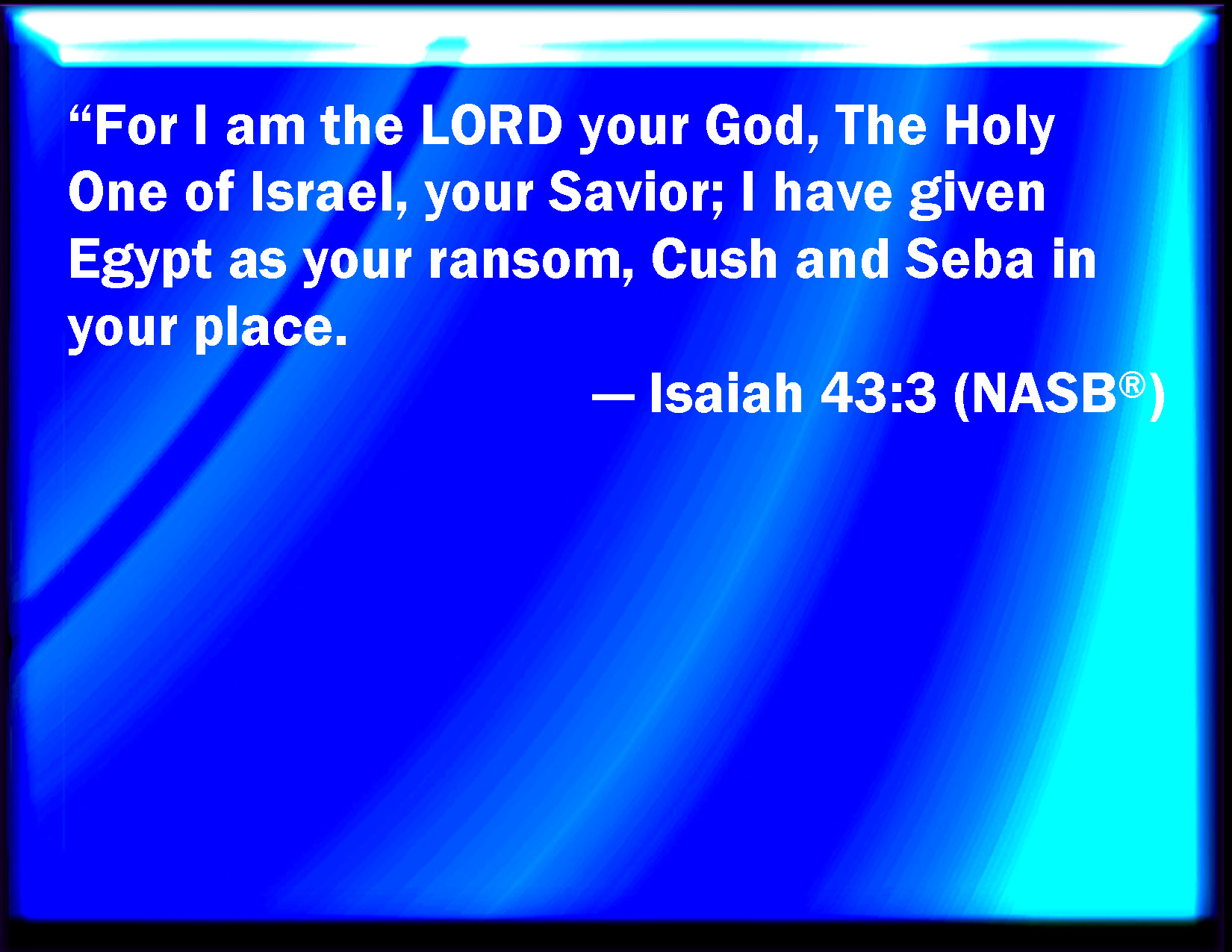 Bible Verse Slide Isaiah 43:3 For I am the LORD your God, the Holy One of Israel, your Savior: I gave Egypt for your ransom, Ethiopia and Seba for you. KJV: For I am the LORD thy God, the Holy One of Israel, thy Saviour: I gave Egypt for thy ransom, Ethiopia and Seba for thee. DRB: For I am the Lord thy God, the Holy One of Israel, thy Saviour: I have given Egypt for thy atonement, Ethiopia and Saba for thee. DBT: For I am Jehovah thy God, the Holy One of Israel, thy Saviour: I gave Egypt for thy ransom, Ethiopia and Seba for thee. ERV: For I am the LORD thy God, the Holy One of Israel, thy saviour; I have given Egypt as thy ransom, Ethiopia and Seba for thee. WBT: For I am the LORD thy God, the Holy One of Israel, thy Savior: I gave Egypt for thy ransom, Cush and Seba for thee. WEB: For I am Yahweh your God, the Holy One of Israel, your Savior. I have given Egypt as your ransom, Ethiopia and Seba in your place. YLT: For I — Jehovah thy God, The Holy One of Israel, thy Saviour, I have appointed Egypt thine atonement, Cush and Seba in thy stead.Links Isaiah 43:3 NIV • Isaiah 43:3 NLT • Isaiah 43:3 ESV • Isaiah 43:3 NASB • Isaiah 43:3 KJV • Isaiah 43:3 Interlinear • Isaiah 43:3 Commentaries • Isaiah 43:3 Parallel Texts • Isaiah 43:3 Bible Apps • Isaiah 43:3 Parallel • Bible Hub |