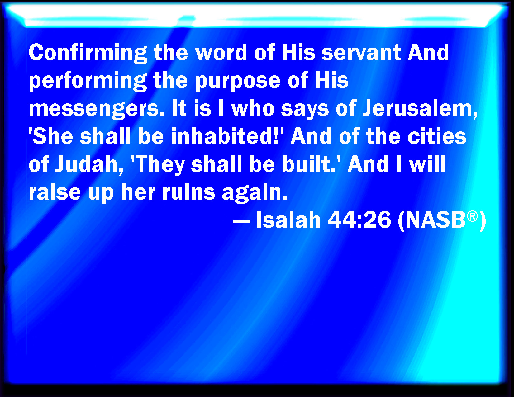 Bible Verse Slide Isaiah 44:26 That confirms the word of his servant, and performes the counsel of his messengers; that said to Jerusalem, You shall be inhabited; and to the cities of Judah, You shall be built, and I will raise up the decayed places thereof: KJV: That confirmeth the word of his servant, and performeth the counsel of his messengers; that saith to Jerusalem, Thou shalt be inhabited; and to the cities of Judah, Ye shall be built, and I will raise up the decayed places thereof: DRB: That raise up the word of my servant and perform the counsel of my messengers, who say to Jerusalem: Thou shalt be inhabited: and to the cities of Juda: You shall be built, and I will raise up the wastes thereof. DBT: that confirmeth the word of his servant, and performeth the counsel of his messengers; that saith to Jerusalem, Thou shalt be inhabited; and to the cities of Judah, Ye shall be built up, and I will raise up their ruins; ERV: that confirmeth the word of his servant, and performeth the counsel of his messengers; that saith of Jerusalem, She shall be inhabited; and of the cities of Judah, They shall be built, and I will raise up the waste places thereof: WBT: That confirmeth the word of his servant, and performeth the counsel of his messengers; that saith to Jerusalem, Thou shalt be inhabited; and to the cities of Judah, Ye shall be built, and I will raise up her decayed places: WEB: who confirms the word of his servant, and performs the counsel of his messengers; who says of Jerusalem, 'She will be inhabited;' and of the cities of Judah, 'They will be built,' and 'I will raise up its waste places;' YLT: Confirming the word of His servant, The counsel of His messengers it perfecteth, Who is saying of Jerusalem, She is inhabited, And of cities of Judah, They shall be built, and her wastes I raise up,Links Isaiah 44:26 NIV • Isaiah 44:26 NLT • Isaiah 44:26 ESV • Isaiah 44:26 NASB • Isaiah 44:26 KJV • Isaiah 44:26 Interlinear • Isaiah 44:26 Commentaries • Isaiah 44:26 Parallel Texts • Isaiah 44:26 Bible Apps • Isaiah 44:26 Parallel • Bible Hub |