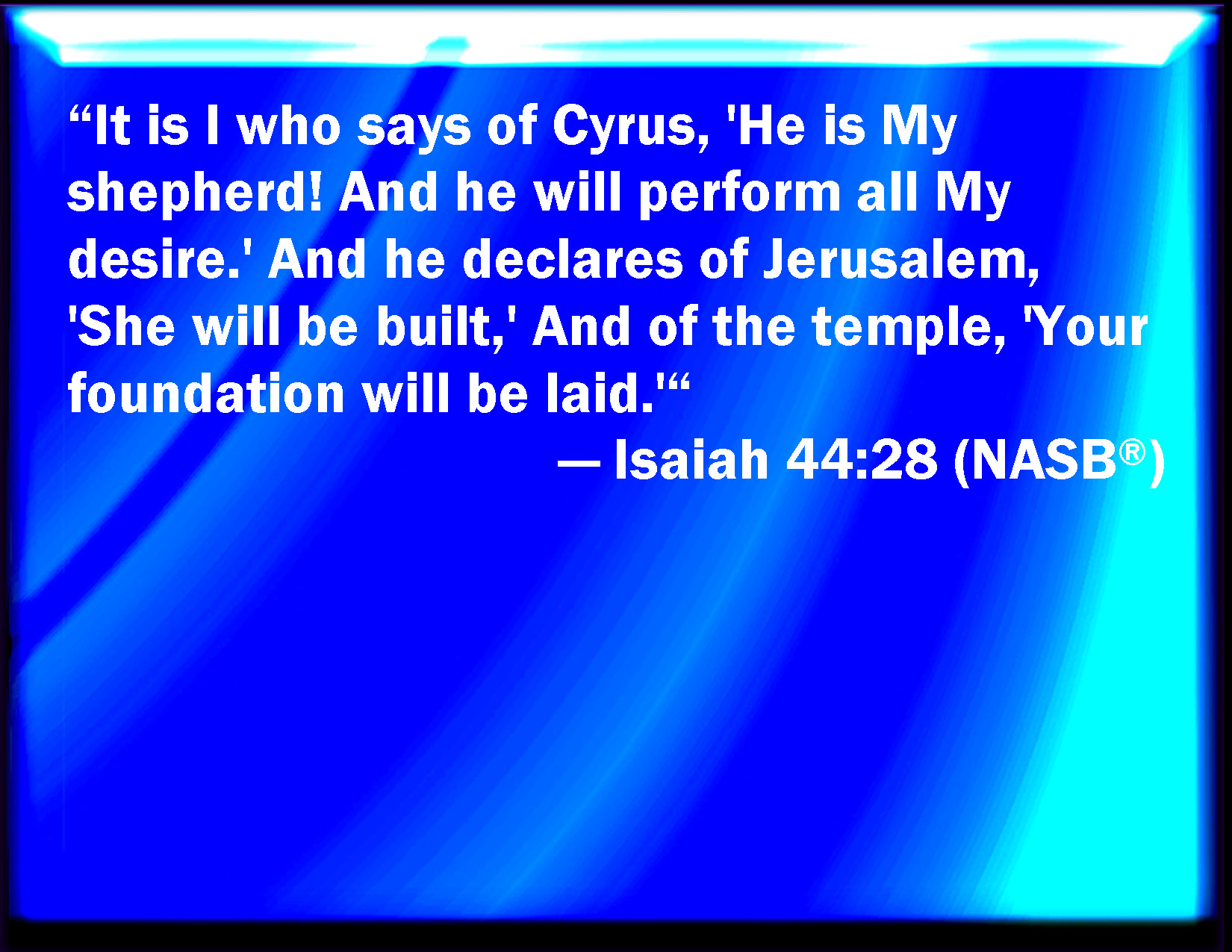 Bible Verse Slide Isaiah 44:28 That said of Cyrus, He is my shepherd, and shall perform all my pleasure: even saying to Jerusalem, You shall be built; and to the temple, Your foundation shall be laid. KJV: That saith of Cyrus, He is my shepherd, and shall perform all my pleasure: even saying to Jerusalem, Thou shalt be built; and to the temple, Thy foundation shall be laid. DRB: Who say to Cyrus: Thou art my shepherd, and thou shalt perform all my pleasure. Who say to Jerusalem: Thou shalt be built: and to the temple: Thy foundations shall be laid. DBT: that saith of Cyrus, He is my shepherd, and he shall perform all my pleasure; even saying to Jerusalem, Thou shalt be built; and to the temple, Thy foundation shall be laid. ERV: That saith of Cyrus, He is my shepherd, and shall perform all my pleasure: even saying of Jerusalem, She shall be built; and to the temple, Thy foundation shall be laid. WBT: That saith of Cyrus, He is my shepherd, and he shall perform all my pleasure: even saying to Jerusalem, Thou shalt be built; and to the temple, Thy foundation shall be laid. WEB: Who says of Cyrus, 'He is my shepherd, and shall perform all my pleasure,' even saying of Jerusalem, 'She will be built;' and of the temple, 'Your foundation will be laid.'" YLT: Who is saying of Cyrus, My shepherd, And all my delight He doth perfect, So as to say of Jerusalem, Thou art built, And of the temple, Thou art founded.Links Isaiah 44:28 NIV • Isaiah 44:28 NLT • Isaiah 44:28 ESV • Isaiah 44:28 NASB • Isaiah 44:28 KJV • Isaiah 44:28 Interlinear • Isaiah 44:28 Commentaries • Isaiah 44:28 Parallel Texts • Isaiah 44:28 Bible Apps • Isaiah 44:28 Parallel • Bible Hub |