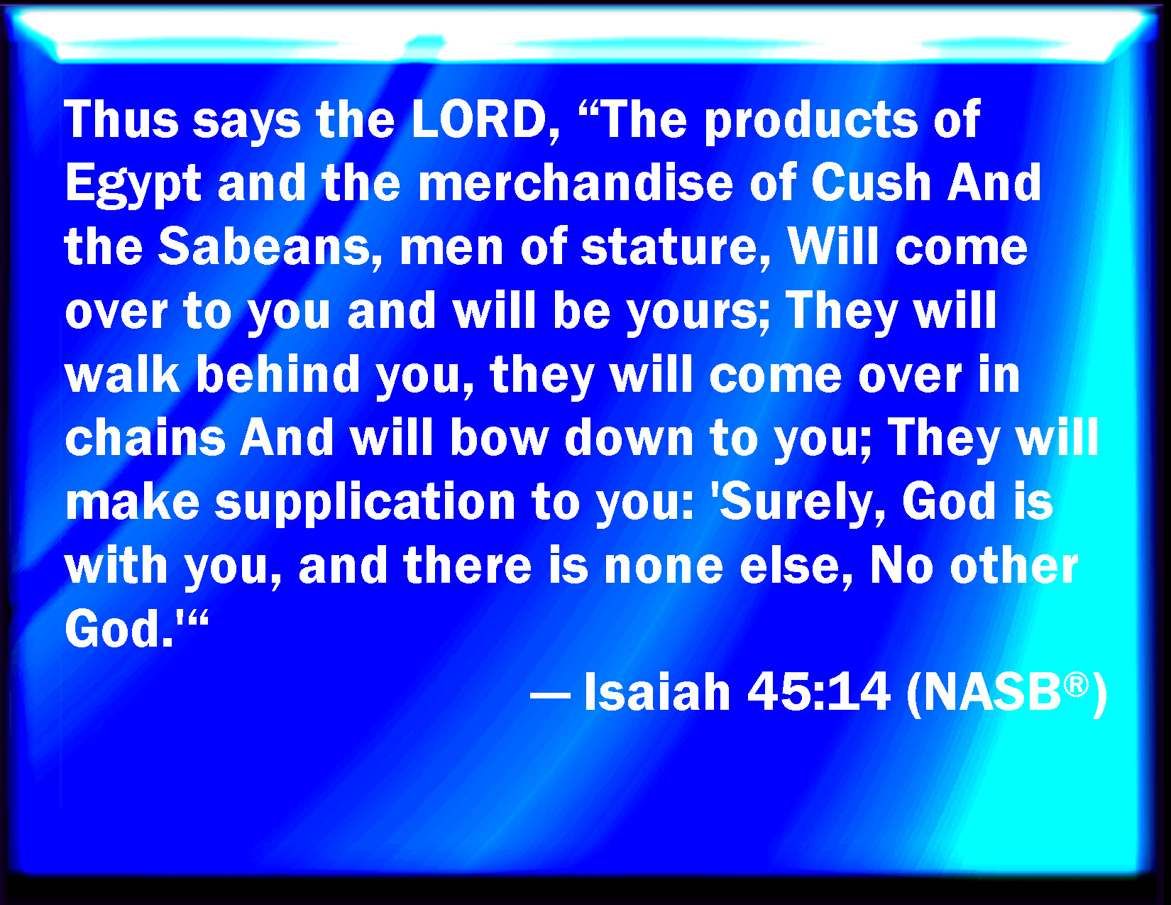 Bible Verse Slide Isaiah 45:14 Thus said the LORD, The labor of Egypt, and merchandise of Ethiopia and of the Sabeans, men of stature, shall come over to you, and they shall be yours: they shall come after you; in chains they shall come over, and they shall fall down to you, they shall make supplication to you, saying, Surely God is in you; and there is none else, there is no God. KJV: Thus saith the LORD, The labour of Egypt, and merchandise of Ethiopia and of the Sabeans, men of stature, shall come over unto thee, and they shall be thine: they shall come after thee; in chains they shall come over, and they shall fall down unto thee, they shall make supplication unto thee, saying, Surely God is in thee; and there is none else, there is no God. DRB: Thus saith the Lord: The labour of Egypt, and the merchandise of Ethiopia, and of Sabaim, men of stature shall come over to thee, and shall be thins: they shall walk after thee, they shall go bound with manacles: and they shall worship thee, and shall make supplication to thee: only in thee is God, and there is no God besides thee. DBT: Thus saith Jehovah: The wealth of Egypt, and the merchandise of Ethiopia and the Sabeans, men of stature, shall come over unto thee, and they shall be thine: they shall walk after thee; in chains they shall come over, and they shall bow down unto thee, they shall make supplication unto thee, saying, Surely God is in thee; and there is none else, no other God. ... ERV: Thus saith the LORD, The labour of Egypt, and the merchandise of Ethiopia, and the Sabeans, men of stature, shall come over unto thee, and they shall be thine; they shall go after thee; in chains they shall come over: and they shall fall down unto thee, they shall make supplication unto thee, saying, Surely God is in thee; and there is none else, there is no God. WBT: Thus saith the LORD, The labor of Egypt, and merchandise of Cush and of the Sabeans, men of stature, shall come over to thee, and they shall be thine: they shall come after thee; in chains they shall come over, and they shall fall down to thee, they shall make supplication to thee, saying, Surely God is in thee; and there is none else, there is no God. WEB: Thus says Yahweh: "The labor of Egypt, and the merchandise of Ethiopia, and the Sabeans, men of stature, shall come over to you, and they shall be yours. They will go after you. They shall come over in chains; and they will bow down to you. They will make supplication to you: 'Surely God is in you; and there is none else. There is no other god. YLT: Thus said Jehovah, 'The labour of Egypt, And the merchandise of Cush, And of the Sebaim — men of measure, Unto thee pass over, and thine they are, After thee they go, in fetters they pass over, And unto thee they bow themselves, Unto thee they pray: Only in thee is God, And there is none else, no other God.Links Isaiah 45:14 NIV • Isaiah 45:14 NLT • Isaiah 45:14 ESV • Isaiah 45:14 NASB • Isaiah 45:14 KJV • Isaiah 45:14 Interlinear • Isaiah 45:14 Commentaries • Isaiah 45:14 Parallel Texts • Isaiah 45:14 Bible Apps • Isaiah 45:14 Parallel • Bible Hub |
