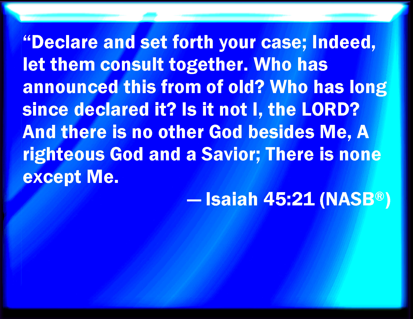 Bible Verse Slide Isaiah 45:21 Tell you, and bring them near; yes, let them take counsel together: who has declared this from ancient time? who has told it from that time? have not I the LORD? and there is no God else beside me; a just God and a Savior; there is none beside me. KJV: Tell ye, and bring them near; yea, let them take counsel together: who hath declared this from ancient time? who hath told it from that time? have not I the LORD? and there is no God else beside me; a just God and a Saviour; there is none beside me. DRB: Tell ye, and come, and consult together: who hath declared this from the beginning, who hath foretold this from that time? Have not I the Lord, and there is no God else besides me? A just God and a saviour, there is none besides me. DBT: Declare and bring them near; yea, let them take counsel together: who hath caused this to be heard from ancient time? who hath declared it long ago? Is it not I, Jehovah? And there is no God else beside me; a just God and a Saviour, there is none besides me. ERV: Declare ye, and bring it forth; yea, let them take counsel together: who hath shewed this from ancient time? who hath declared it of old? have not I the LORD? and there is no God else beside me; a just God and a saviour; there is none beside me. WBT: Tell ye, and bring them near; yes, let them take counsel together: who hath declared this from ancient time? who hath told it from that time? have not I the LORD? and there is no God else besides me; a just God and a Savior; there is none besides me. WEB: Declare and present it. Yes, let them take counsel together. Who has shown this from ancient time? Who has declared it of old? Haven't I, Yahweh? There is no other God besides me, a just God and a Savior; There is no one besides me. YLT: Declare ye, and bring near, Yea, they take counsel together, Who hath proclaimed this from of old? From that time hath declared it? Is it not I — Jehovah? And there is no other god besides Me, A God righteous and saving, there is none save Me.Links Isaiah 45:21 NIV • Isaiah 45:21 NLT • Isaiah 45:21 ESV • Isaiah 45:21 NASB • Isaiah 45:21 KJV • Isaiah 45:21 Interlinear • Isaiah 45:21 Commentaries • Isaiah 45:21 Parallel Texts • Isaiah 45:21 Bible Apps • Isaiah 45:21 Parallel • Bible Hub |