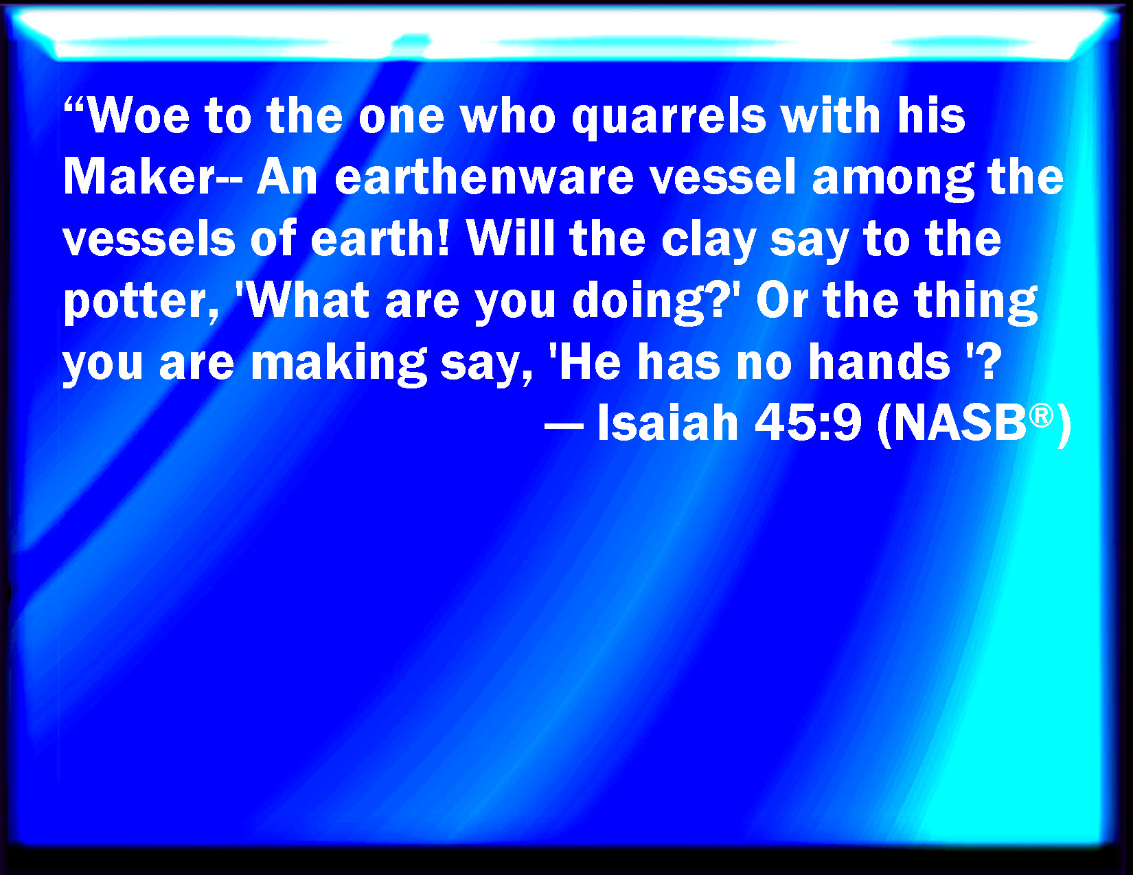Bible Verse Slide Isaiah 45:9 Woe to him that strives with his Maker! Let the potsherd strive with the potsherds of the earth. Shall the clay say to him that fashions it, What make you? or your work, He has no hands? KJV: Woe unto him that striveth with his Maker! Let the potsherd strive with the potsherds of the earth. Shall the clay say to him that fashioneth it, What makest thou? or thy work, He hath no hands? DRB: Woe to him that gainsayeth his maker, a sherd of the earthen pots: shall the clay say to him that fashioneth it: What art thou making, and thy work is without hands? DBT: Woe unto him that striveth with his Maker! Let a potsherd strive with the potsherds of the earth. Shall the clay say to him that formeth it, What makest thou? Or thy work, He hath no hands? ERV: Woe unto him that striveth with his Maker! a potsherd among the potsherds of the earth! shall the clay say to him that fashioneth it, What makest thou? or thy work, He hath no hands? WBT: Woe to him that contendeth with his Maker! Let the potsherd contend with the potsherds of the earth. Shall the clay say to him that fashioneth it, What makest thou? or thy work, He hath no hands? WEB: Woe to him who strives with his Maker— a clay pot among the clay pots of the earth! Shall the clay ask him who fashions it, 'What are you making?' or your work, 'He has no hands?' YLT: Woe to him who is striving with his Former, (A potsherd with potsherds of the ground!) Doth clay say to its Framer, 'What dost thou?' And thy work, 'He hath no hands?'Links Isaiah 45:9 NIV • Isaiah 45:9 NLT • Isaiah 45:9 ESV • Isaiah 45:9 NASB • Isaiah 45:9 KJV • Isaiah 45:9 Interlinear • Isaiah 45:9 Commentaries • Isaiah 45:9 Parallel Texts • Isaiah 45:9 Bible Apps • Isaiah 45:9 Parallel • Bible Hub |