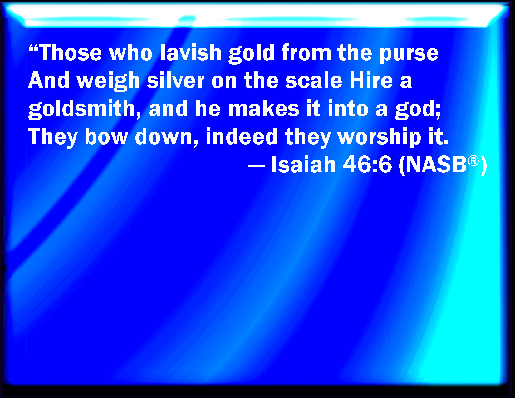 Bible Verse Slide Isaiah 46:6 They lavish gold out of the bag, and weigh silver in the balance, and hire a goldsmith; and he makes it a god: they fall down, yes, they worship. KJV: They lavish gold out of the bag, and weigh silver in the balance, and hire a goldsmith; and he maketh it a god: they fall down, yea, they worship. DRB: You that contribute gold out of the bag, and weigh out silver in the scales: and hire a goldsmith to make a god: and they fall down and worship. DBT: They lavish gold out of the bag, and weigh silver in the balance; they hire a goldsmith, and he maketh it a god: they fall down, yea, they worship. ERV: Such as lavish gold out of the bag, and weigh silver in the balance, they hire a goldsmith, and he maketh it a god; they fall down, yea, they worship. WBT: They lavish gold out of the bag, and weigh silver in the balance, and hire a goldsmith; and he maketh it a god: they fall down, yes, they worship. WEB: Some pour out gold from the bag, and weigh silver in the balance. They hire a goldsmith, and he makes it a god. They fall down—yes, they worship. YLT: — They are pouring out gold from a bag, And silver on the beam they weigh, They hire a refiner, and he maketh it a god, They fall down, yea, they bow themselves.Links Isaiah 46:6 NIV • Isaiah 46:6 NLT • Isaiah 46:6 ESV • Isaiah 46:6 NASB • Isaiah 46:6 KJV • Isaiah 46:6 Interlinear • Isaiah 46:6 Commentaries • Isaiah 46:6 Parallel Texts • Isaiah 46:6 Bible Apps • Isaiah 46:6 Parallel • Bible Hub |