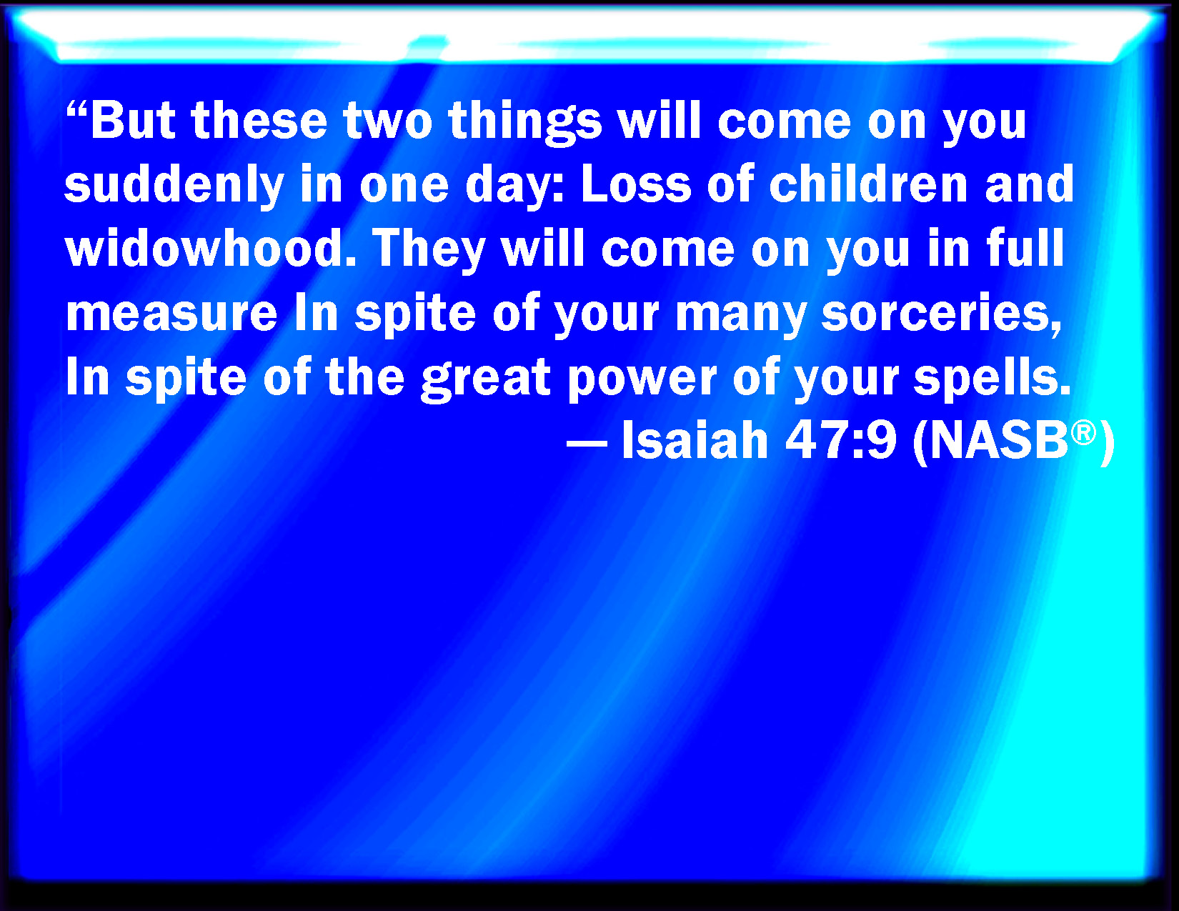 Bible Verse Slide Isaiah 47:9 But these two things shall come to you in a moment in one day, the loss of children, and widowhood: they shall come on you in their perfection for the multitude of your sorceries, and for the great abundance of your enchantments. KJV: But these two things shall come to thee in a moment in one day, the loss of children, and widowhood: they shall come upon thee in their perfection for the multitude of thy sorceries, and for the great abundance of thine enchantments. DRB: These two things shall come upon thee suddenly in one day, barrenness and widowhood. All things are come upon thee, because of the multitude of thy sorceries, and for the great hardness of thy enchanters. DBT: yet these two things shall come upon thee in a moment, in one day, loss of children and widowhood; they shall come upon thee in full measure for the multitude of thy sorceries, for the great abundance of thine enchantments. ERV: but these two things shall come to thee in a moment in one day, the loss of children, and widowhood: in their full measure shall they come upon thee, despite of the multitude of thy sorceries, and the great abundance of thine enchantments. WBT: But these two things shall come to thee in a moment in one day, the loss of children, and widowhood: they shall come upon thee in their perfection, for the multitude of thy sorceries, and for the great abundance of thy enchantments. WEB: but these two things shall come to you in a moment in one day, the loss of children, and widowhood; in their full measure shall they come on you, in the multitude of your sorceries, and the great abundance of your enchantments. YLT: And come in to thee do these two things, In a moment, in one day, childlessness and widowhood, According to their perfection they have come upon thee, In the multitude of thy sorceries, In the exceeding might of thy charms.Links Isaiah 47:9 NIV • Isaiah 47:9 NLT • Isaiah 47:9 ESV • Isaiah 47:9 NASB • Isaiah 47:9 KJV • Isaiah 47:9 Interlinear • Isaiah 47:9 Commentaries • Isaiah 47:9 Parallel Texts • Isaiah 47:9 Bible Apps • Isaiah 47:9 Parallel • Bible Hub |