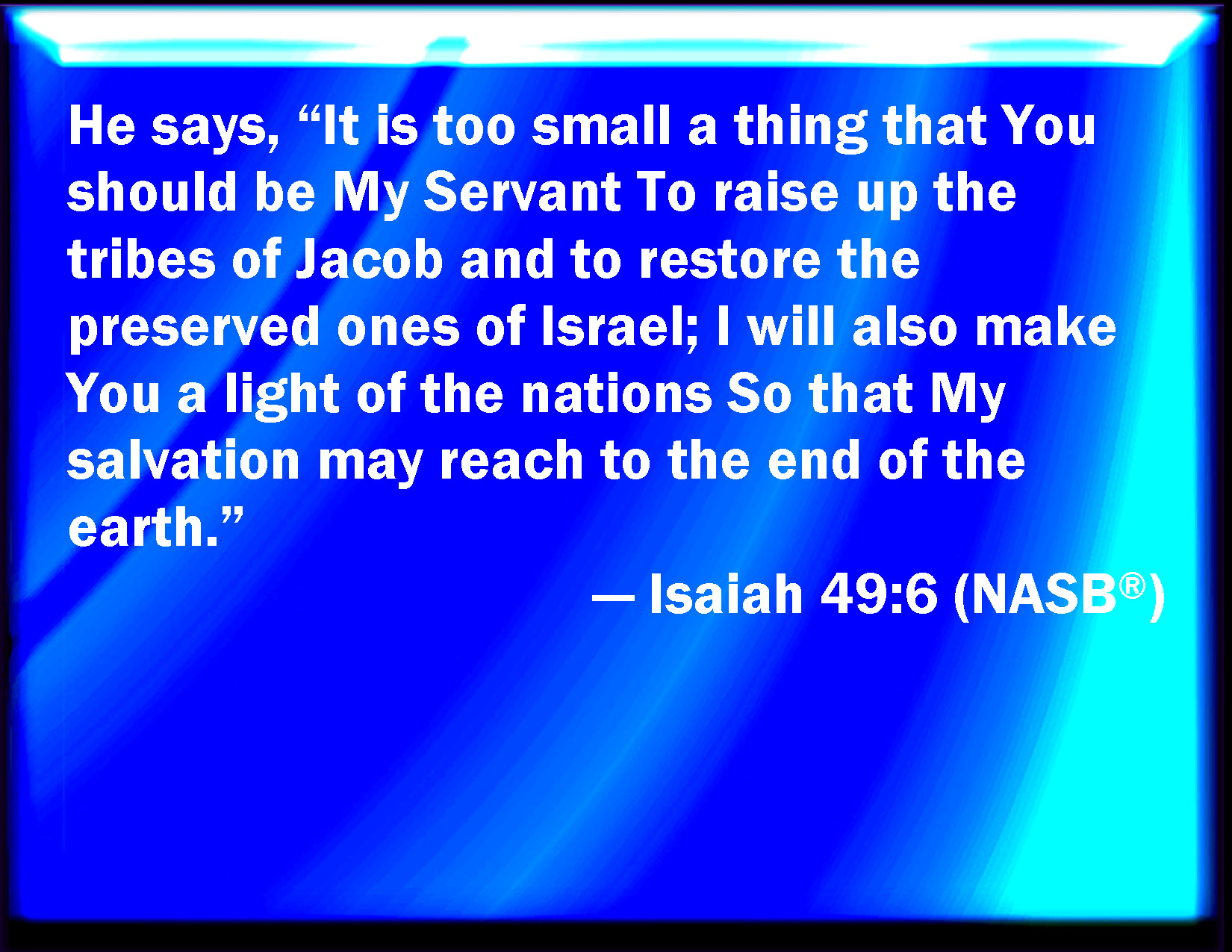 Bible Verse Slide Isaiah 49:6 And he said, It is a light thing that you should be my servant to raise up the tribes of Jacob, and to restore the preserved of Israel: I will also give you for a light to the Gentiles, that you may be my salvation to the end of the earth. KJV: And he said, It is a light thing that thou shouldest be my servant to raise up the tribes of Jacob, and to restore the preserved of Israel: I will also give thee for a light to the Gentiles, that thou mayest be my salvation unto the end of the earth. DRB: And he said: It is a small thing that thou shouldst be my servant to raise up the tribes of Jacob, and to convert the dregs of Israel. Behold, I have given thee to be the light of the Gentiles, that thou mayst be my salvation even to the farthest part of the earth. DBT: and he saith, It is a small thing that thou shouldest be my servant to raise up the tribes of Jacob, and to restore the preserved of Israel; I have even given thee for a light of the nations, that thou mayest be my salvation unto the end of the earth. ERV: yea, he saith, It is too light a thing that thou shouldest be my servant to raise up the tribes of Jacob, and to restore the preserved of Israel: I will also give thee for a light to the Gentiles, that thou mayest be my salvation unto the end of the earth. WBT: And he said, It is a light thing that thou shouldst be my servant to raise up the tribes of Jacob, and to restore the preserved of Israel: I will also give thee for a light to the Gentiles, that thou mayest be my salvation to the end of the earth. WEB: yes, he says, "It is too light a thing that you should be my servant to raise up the tribes of Jacob, and to restore the preserved of Israel: I will also give you for a light to the nations, that you may be my salvation to the end of the earth." YLT: And He saith, 'It hath been a light thing That thou art to Me for a servant To raise up the tribes of Jacob, And the preserved of Israel to bring back, And I have given thee for a light of nations, To be My salvation unto the end of the earth.'Links Isaiah 49:6 NIV • Isaiah 49:6 NLT • Isaiah 49:6 ESV • Isaiah 49:6 NASB • Isaiah 49:6 KJV • Isaiah 49:6 Interlinear • Isaiah 49:6 Commentaries • Isaiah 49:6 Parallel Texts • Isaiah 49:6 Bible Apps • Isaiah 49:6 Parallel • Bible Hub |