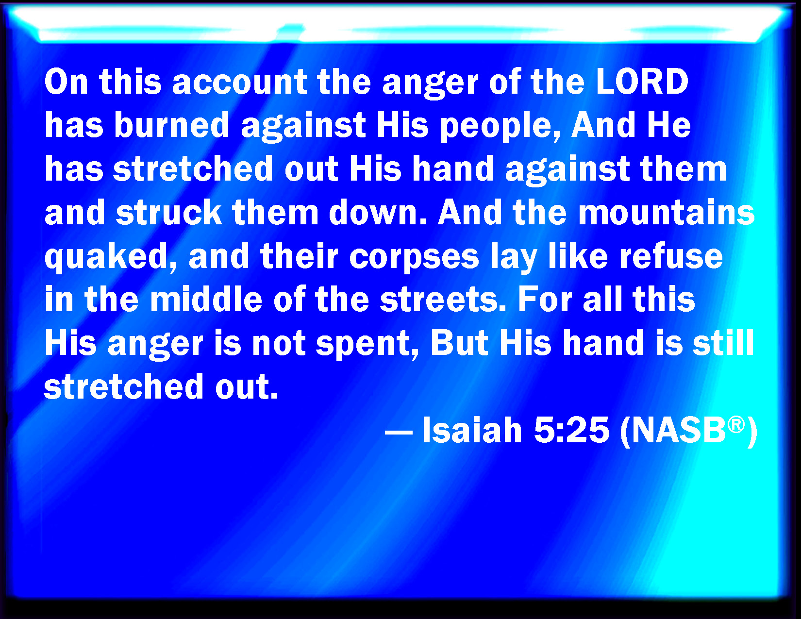 Bible Verse Slide Isaiah 5:25 Therefore is the anger of the LORD kindled against his people, and he has stretched forth his hand against them, and has smitten them: and the hills did tremble, and their carcasses were torn in the middle of the streets. For all this his anger is not turned away, but his hand is stretched out still. KJV: Therefore is the anger of the LORD kindled against his people, and he hath stretched forth his hand against them, and hath smitten them: and the hills did tremble, and their carcases were torn in the midst of the streets. For all this his anger is not turned away, but his hand is stretched out still. DRB: Therefore is the wrath of the Lord kindled against his people, and he hath stretched out his hand upon them, and struck them: and the mountains were troubled, and their carcasses became as dung in the midst of the streets. For all this his anger is not turned away, but his hand is stretched out still. DBT: Therefore is the anger of Jehovah kindled against his people, and he hath stretched out his hand against them and hath smitten them; and the mountains trembled, and their carcases are become as dung in the midst of the streets. For all this his anger is not turned away, and his hand is stretched out still. ERV: Therefore is the anger of the LORD kindled against his people, and he hath stretched forth his hand against them, and hath smitten them, and the hills did tremble, and their carcases were as refuse in the midst of the streets. For all this his anger is not turned away, but his hand is stretched out still. WBT: Therefore is the anger of the LORD kindled against his people, and he hath stretched forth his hand against them, and hath smitten them: and the hills trembled, and their carcasses were torn in the midst of the streets. For all this his anger is not turned away, but his hand is stretched out still. WEB: Therefore Yahweh's anger burns against his people, and he has stretched out his hand against them, and has struck them. The mountains tremble, and their dead bodies are as refuse in the midst of the streets. For all this, his anger is not turned away, but his hand is still stretched out. YLT: Therefore hath the anger of Jehovah burned among His people, And He stretcheth out His hand against it, And smiteth it, and the mountains tremble, And their carcase is as filth in the midst of the out-places. With all this His anger did not turn back, And still His hand is stretched out!Links Isaiah 5:25 NIV • Isaiah 5:25 NLT • Isaiah 5:25 ESV • Isaiah 5:25 NASB • Isaiah 5:25 KJV • Isaiah 5:25 Interlinear • Isaiah 5:25 Commentaries • Isaiah 5:25 Parallel Texts • Isaiah 5:25 Bible Apps • Isaiah 5:25 Parallel • Bible Hub |