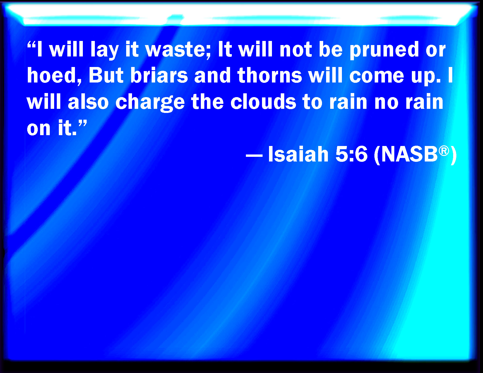 Bible Verse Slide Isaiah 5:6 And I will lay it waste: it shall not be pruned, nor dig; but there shall come up briers and thorns: I will also command the clouds that they rain no rain on it. KJV: And I will lay it waste: it shall not be pruned, nor digged; but there shall come up briers and thorns: I will also command the clouds that they rain no rain upon it. DRB: And I will make it desolate: it shall not be pruned, and it shall not be digged: but briers and thorns shall come up: and I will command the clouds to rain no rain upon it. DBT: and I will make it a waste it shall not be pruned nor cultivated, but there shall come up briars and thorns; and I will command the clouds that they rain no rain upon it. ERV: and I will lay it waste; it shall not be pruned nor hoed; but there shall come up briers and thorns: I will also command the clouds that they rain no rain upon it. WBT: And I will lay it waste: it shall not be pruned, nor digged; but there shall come up briers and thorns: I will also command the clouds that they rain no rain upon it. WEB: I will lay it a wasteland. It won't be pruned nor hoed, but it will grow briers and thorns. I will also command the clouds that they rain no rain on it." YLT: And I make it a waste, It is not pruned, nor arranged, And gone up have brier and thorn, And on the thick clouds I lay a charge, From raining upon it rain.Links Isaiah 5:6 NIV • Isaiah 5:6 NLT • Isaiah 5:6 ESV • Isaiah 5:6 NASB • Isaiah 5:6 KJV • Isaiah 5:6 Interlinear • Isaiah 5:6 Commentaries • Isaiah 5:6 Parallel Texts • Isaiah 5:6 Bible Apps • Isaiah 5:6 Parallel • Bible Hub |