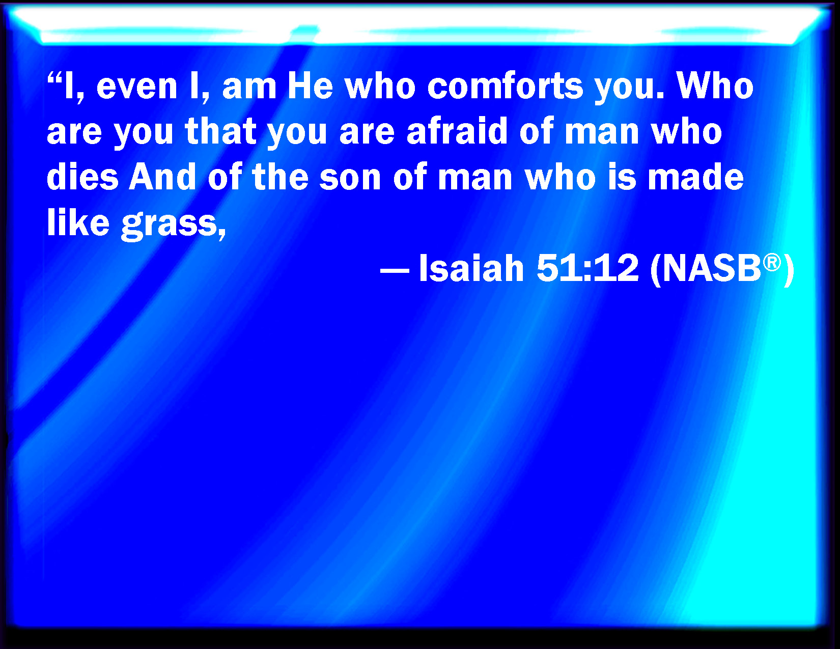 Bible Verse Slide Isaiah 51:12 I, even I, am he that comforts you: who are you, that you should be afraid of a man that shall die, and of the son of man which shall be made as grass; KJV: I, even I, am he that comforteth you: who art thou, that thou shouldest be afraid of a man that shall die, and of the son of man which shall be made as grass; DRB: I, I myself will comfort you: who art thou, that thou shouldst be afraid of a mortal man, and of the son of man, who shall wither away like grass? DBT: I, even I, am he that comforteth you: who art thou, that thou fearest a man that shall die, and the son of man that shall become as grass; ERV: I, even I, am he that comforteth you: who art thou, that thou art afraid of man that shall die, and of the son of man which shall be made as grass; WBT: I, even I, am he that comforteth you: who art thou, that thou shouldest be afraid of a man that shall die, and of the son of man who shall be made as grass; WEB: "I, even I, am he who comforts you: who are you, that you are afraid of man who shall die, and of the son of man who shall be made as grass; YLT: I — I am He — your comforter, Who art thou — and thou art afraid of man? he dieth! And of the son of man — grass he is made!Links Isaiah 51:12 NIV • Isaiah 51:12 NLT • Isaiah 51:12 ESV • Isaiah 51:12 NASB • Isaiah 51:12 KJV • Isaiah 51:12 Interlinear • Isaiah 51:12 Commentaries • Isaiah 51:12 Parallel Texts • Isaiah 51:12 Bible Apps • Isaiah 51:12 Parallel • Bible Hub |