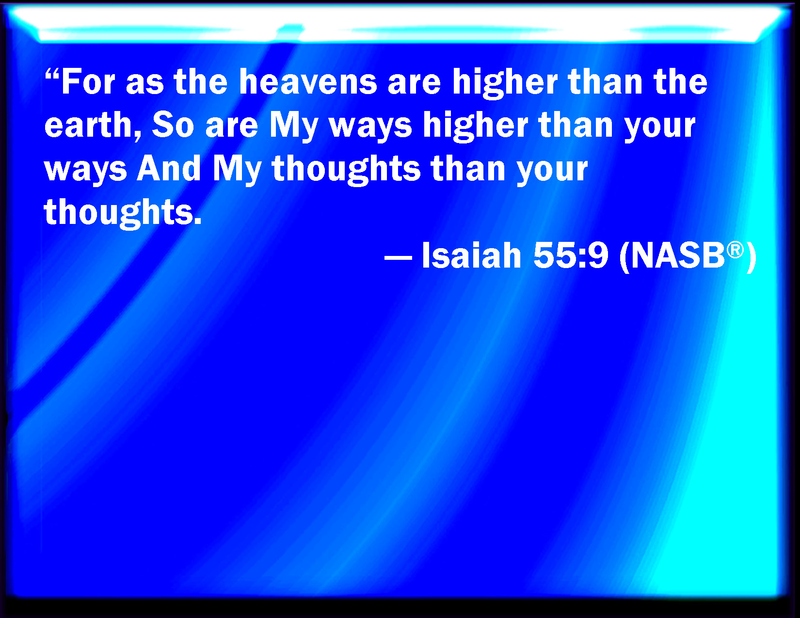Bible Verse Slide Isaiah 55:9 For as the heavens are higher than the earth, so are my ways higher than your ways, and my thoughts than your thoughts. KJV: For as the heavens are higher than the earth, so are my ways higher than your ways, and my thoughts than your thoughts. DRB: For as the heavens are exalted above the earth, so are my ways exalted above your ways, and my thoughts above your thoughts. DBT: For as the heavens are higher than the earth, so are my ways higher than your ways, and my thoughts than your thoughts. ERV: For as the heavens are higher than the earth, so are my ways higher than your ways, and my thoughts than your thoughts. WBT: For as the heavens are higher than the earth, so are my ways higher than your ways, and my thoughts than your thoughts. WEB: "For as the heavens are higher than the earth, so are my ways higher than your ways, and my thoughts than your thoughts. YLT: For high have the heavens been above the earth, So high have been My ways above your ways, And My thoughts above your thoughts.Links Isaiah 55:9 NIV • Isaiah 55:9 NLT • Isaiah 55:9 ESV • Isaiah 55:9 NASB • Isaiah 55:9 KJV • Isaiah 55:9 Interlinear • Isaiah 55:9 Commentaries • Isaiah 55:9 Parallel Texts • Isaiah 55:9 Bible Apps • Isaiah 55:9 Parallel • Bible Hub |