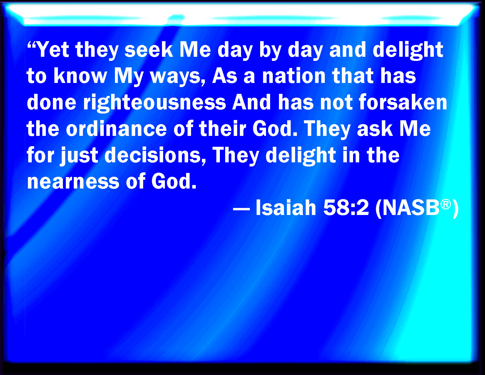 Bible Verse Slide Isaiah 58:2 Yet they seek me daily, and delight to know my ways, as a nation that did righteousness, and forsook not the ordinance of their God: they ask of me the ordinances of justice; they take delight in approaching to God. KJV: Yet they seek me daily, and delight to know my ways, as a nation that did righteousness, and forsook not the ordinance of their God: they ask of me the ordinances of justice; they take delight in approaching to God. DRB: For they seek me from day to day, sad desire to know my ways, as a nation that hath done justice, and hath not forsaken the judgment of their God: they ask of me the judgments of justice: they are willing to approach to God. DBT: Yet they seek me daily, and delight to know my ways, as a nation that doeth righteousness, and hath not forsaken the ordinance of their God; they ask of me the ordinances of righteousness, they take delight in approaching to God: ERV: Yet they seek me daily, and delight to know my ways: as a nation that did righteousness and forsook not the ordinance of their God, they ask of me righteous ordinances, they delight to draw near unto God. WBT: Yet they seek me daily, and delight to know my ways, as a nation that did righteousness, and forsook not the ordinance of their God: they ask of me the ordinances of justice; they take delight in approaching to God. WEB: Yet they seek me daily, and delight to know my ways: as a nation that did righteousness, and didn't forsake the ordinance of their God, they ask of me righteous judgments; they delight to draw near to God. YLT: Seeing — Me day by day they seek, And the knowledge of My ways they desire, As a nation that righteousness hath done, And the judgment of its God hath not forsaken, They ask of me judgments of righteousness, The drawing near of God they desire:Links Isaiah 58:2 NIV • Isaiah 58:2 NLT • Isaiah 58:2 ESV • Isaiah 58:2 NASB • Isaiah 58:2 KJV • Isaiah 58:2 Interlinear • Isaiah 58:2 Commentaries • Isaiah 58:2 Parallel Texts • Isaiah 58:2 Bible Apps • Isaiah 58:2 Parallel • Bible Hub |