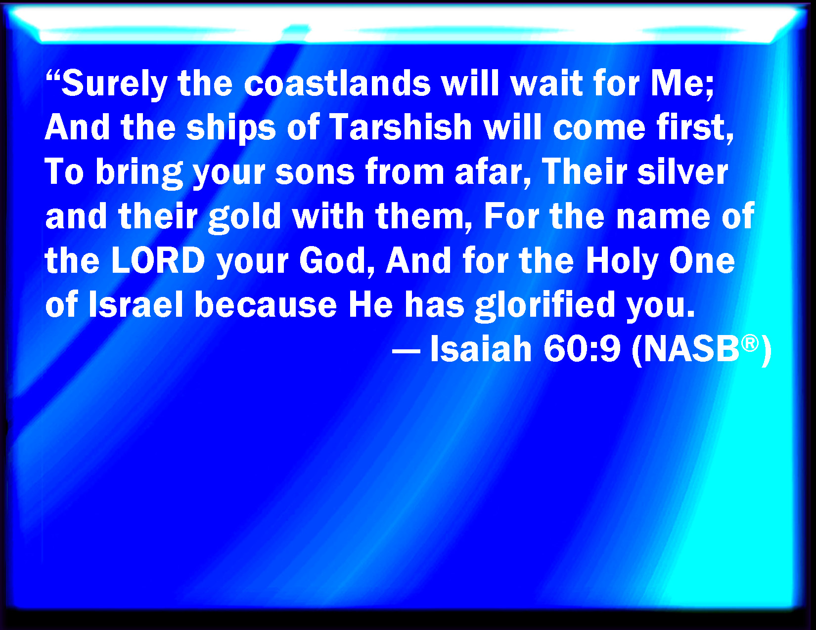 Bible Verse Slide Isaiah 60:9 Surely the isles shall wait for me, and the ships of Tarshish first, to bring your sons from far, their silver and their gold with them, to the name of the LORD your God, and to the Holy One of Israel, because he has glorified you. KJV: Surely the isles shall wait for me, and the ships of Tarshish first, to bring thy sons from far, their silver and their gold with them, unto the name of the LORD thy God, and to the Holy One of Israel, because he hath glorified thee. DRB: For, the islands wait for me, and the ships of the sea in the beginning: that I may bring thy sons from afar: their silver, and their gold with them, to the name of the Lord thy God, and to the Holy One of Israel, because he hath glorified thee. DBT: For the isles shall await me, and the ships of Tarshish first, to bring thy sons from afar, their silver and their gold with them, unto the name of Jehovah thy God, and to the Holy One of Israel, for he hath glorified thee. ERV: Surely the isles shall wait for me, and the ships of Tarshish first, to bring thy sons from far, their silver and their gold with them, for the name of the LORD thy God, and for the Holy One of Israel, because he hath glorified thee. WBT: Surely the isles shall wait for me, and the ships of Tarshish first, to bring thy sons from far, their silver and their gold with them, to the name of the LORD thy God, and to the Holy One of Israel, because he hath glorified thee. WEB: Surely the islands shall wait for me, and the ships of Tarshish first, to bring your sons from far, their silver and their gold with them, for the name of Yahweh your God, and for the Holy One of Israel, because he has glorified you. YLT: Surely for Me isles do wait, And ships of Tarshish first, To bring thy sons from afar, Their silver and their gold with them, To the name of Jehovah thy God, And to the Holy One of Israel, Because He hath beautified thee.Links Isaiah 60:9 NIV • Isaiah 60:9 NLT • Isaiah 60:9 ESV • Isaiah 60:9 NASB • Isaiah 60:9 KJV • Isaiah 60:9 Interlinear • Isaiah 60:9 Commentaries • Isaiah 60:9 Parallel Texts • Isaiah 60:9 Bible Apps • Isaiah 60:9 Parallel • Bible Hub |