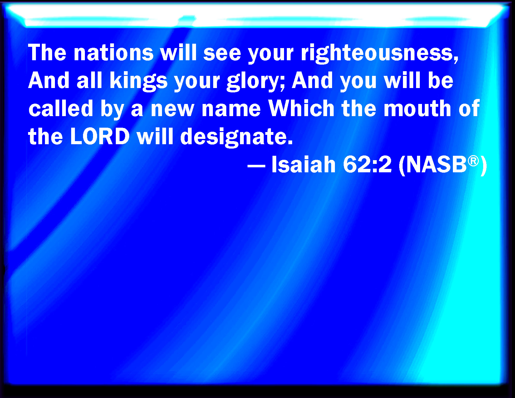 Bible Verse Slide Isaiah 62:2 And the Gentiles shall see your righteousness, and all kings your glory: and you shall be called by a new name, which the mouth of the LORD shall name. KJV: And the Gentiles shall see thy righteousness, and all kings thy glory: and thou shalt be called by a new name, which the mouth of the LORD shall name. DRB: And the Gentiles shall see thy just one, and all kings thy glorious one: and thou shalt be called by a new name, which the mouth of the Lord shall name. DBT: And the nations shall see thy righteousness, and all kings thy glory; and thou shalt be called by a new name, which the mouth of Jehovah will name. ERV: And the nations shall see thy righteousness, and all kings thy glory: and thou shalt be called by a new name, which the mouth of the LORD shall name. WBT: And the Gentiles shall see thy righteousness, and all kings thy glory: and thou shalt be called by a new name, which the mouth of the LORD shall name. WEB: The nations shall see your righteousness, and all kings your glory, and you shall be called by a new name, which the mouth of Yahweh shall name. YLT: And nations have seen thy righteousness, And all kings thine honour, And He is giving to thee a new name, That the mouth of Jehovah doth define.Links Isaiah 62:2 NIV • Isaiah 62:2 NLT • Isaiah 62:2 ESV • Isaiah 62:2 NASB • Isaiah 62:2 KJV • Isaiah 62:2 Interlinear • Isaiah 62:2 Commentaries • Isaiah 62:2 Parallel Texts • Isaiah 62:2 Bible Apps • Isaiah 62:2 Parallel • Bible Hub |