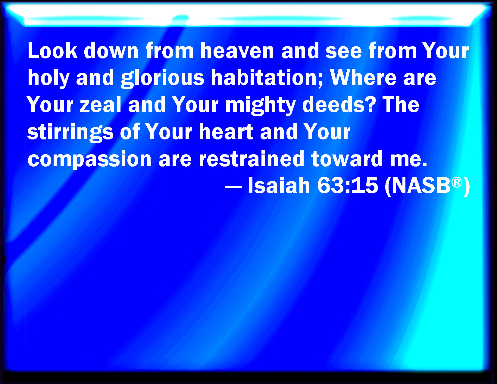 Bible Verse Slide Isaiah 63:15 Look down from heaven, and behold from the habitation of your holiness and of your glory: where is your zeal and your strength, the sounding of your bowels and of your mercies toward me? are they restrained? KJV: Look down from heaven, and behold from the habitation of thy holiness and of thy glory: where is thy zeal and thy strength, the sounding of thy bowels and of thy mercies toward me? are they restrained? DRB: Look down from heaven, and behold from thy holy habitation and the place of thy glory: where is thy zeal, and thy strength, the multitude of thy bowels, and of thy mercies? they have held back themselves from me. DBT: Look down from the heavens, and behold from the habitation of thy holiness and of thy glory! Where is thy zeal and thy strength, the sounding of thy bowels and of thy tender mercies? Are they restrained toward me? ERV: Look down from heaven, and behold from the habitation of thy holiness and of thy glory: where is thy zeal and thy mighty acts? the yearning of thy bowels and thy compassions are restrained toward me. WBT: Look down from heaven, and behold from the habitation of thy holiness and of thy glory: where is thy zeal and thy strength, the sounding of thy bowels and of thy mercies towards me? are they restrained? WEB: Look down from heaven, and see from the habitation of your holiness and of your glory: where are your zeal and your mighty acts? the yearning of your heart and your compassion is restrained toward me. YLT: Look attentively from the heavens, And see from Thy holy and beauteous habitation, Where is Thy zeal and Thy might? The multitude of Thy bowels and Thy mercies Towards me have refrained themselves.Links Isaiah 63:15 NIV • Isaiah 63:15 NLT • Isaiah 63:15 ESV • Isaiah 63:15 NASB • Isaiah 63:15 KJV • Isaiah 63:15 Interlinear • Isaiah 63:15 Commentaries • Isaiah 63:15 Parallel Texts • Isaiah 63:15 Bible Apps • Isaiah 63:15 Parallel • Bible Hub |