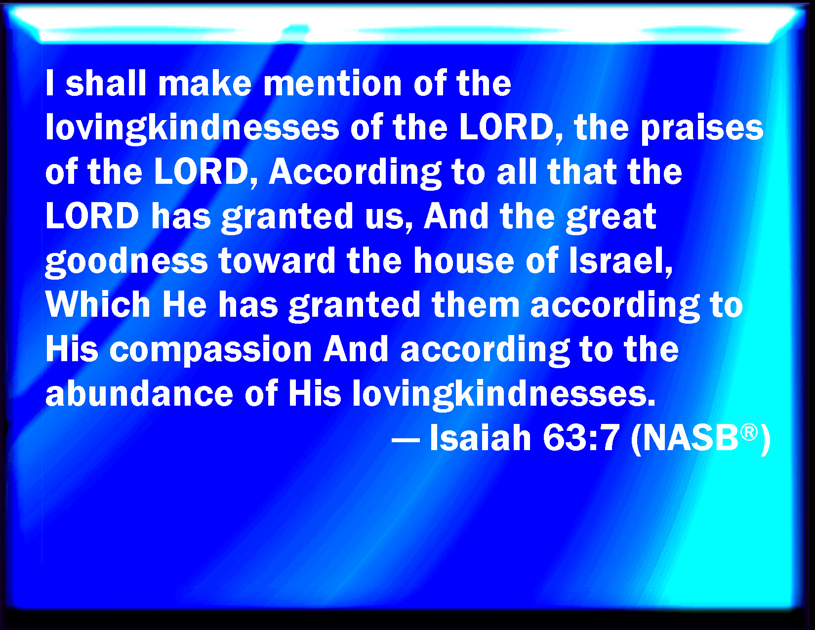 Bible Verse Slide Isaiah 63:7 I will mention the loving kindnesses of the LORD, and the praises of the LORD, according to all that the LORD has bestowed on us, and the great goodness toward the house of Israel, which he has bestowed on them according to his mercies, and according to the multitude of his loving kindnesses. KJV: I will mention the lovingkindnesses of the LORD, and the praises of the LORD, according to all that the LORD hath bestowed on us, and the great goodness toward the house of Israel, which he hath bestowed on them according to his mercies, and according to the multitude of his lovingkindnesses. DRB: I will remember the tender mercies of the Lord, the praise of the Lord for all the things that the Lord hath bestowed upon us, and for the multitude of his good things to the house of Israel, which he hath given them according to his kindness, and according to the multitude of his mercies. DBT: I will record the loving-kindnesses of Jehovah, the praises of Jehovah, according to all that Jehovah hath bestowed upon us, and the great goodness toward the house of Israel which he hath bestowed upon them according to his mercies, and according to the multitude of his loving-kindnesses. ERV: I will make mention of the lovingkindnesses of the LORD, and the praises of the LORD, according to all that the LORD hath bestowed on us; and the great goodness toward the house of Israel, which he hath bestowed on them according to his mercies, and according to the multitude of his lovingkindnesses. WBT: I will mention the loving-kindnesses of the LORD, and the praises of the LORD, according to all that the LORD hath bestowed on us, and the great goodness towards the house of Israel, which he hath bestowed on them according to his mercies, and according to the multitude of his loving-kindnesses. WEB: I will make mention of the loving kindnesses of Yahweh, [and] the praises of Yahweh, according to all that Yahweh has bestowed on us, and the great goodness toward the house of Israel, which he has bestowed on them according to his mercies, and according to the multitude of his loving kindnesses. YLT: The kind acts of Jehovah I make mention of, The praises of Jehovah, According to all that Jehovah hath done for us, And the abundance of the goodness to the house of Israel, That He hath done for them, According to His mercies, And according to the abundance of His kind acts.Links Isaiah 63:7 NIV • Isaiah 63:7 NLT • Isaiah 63:7 ESV • Isaiah 63:7 NASB • Isaiah 63:7 KJV • Isaiah 63:7 Interlinear • Isaiah 63:7 Commentaries • Isaiah 63:7 Parallel Texts • Isaiah 63:7 Bible Apps • Isaiah 63:7 Parallel • Bible Hub |