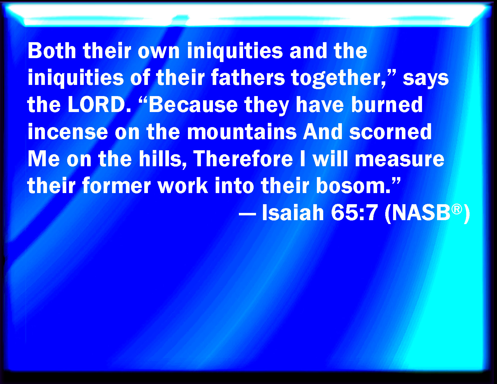 Bible Verse Slide Isaiah 65:7 Your iniquities, and the iniquities of your fathers together, said the LORD, which have burned incense on the mountains, and blasphemed me on the hills: therefore will I measure their former work into their bosom. KJV: Your iniquities, and the iniquities of your fathers together, saith the LORD, which have burned incense upon the mountains, and blasphemed me upon the hills: therefore will I measure their former work into their bosom. DRB: Your iniquities, and the iniquities of your fathers together, saith the Lord, who have sacrificed upon the mountains, and have reproached me upon the hills; and I will measure back their first work in their bosom. DBT: your iniquities, and the iniquities of your fathers together, saith Jehovah, who have burned incense upon the mountains, and outraged me upon the hills; and I will measure their former work into their bosom. ERV: your own iniquities, and the iniquities of your fathers together, saith the LORD, which have burned incense upon the mountains, and blasphemed me upon the hills: therefore will I first measure their work into their bosom. WBT: Your iniquities, and the iniquities of your fathers together, saith the LORD, who have burned incense upon the mountains, and blasphemed me upon the hills: therefore will I measure their former work into their bosom. WEB: your own iniquities, and the iniquities of your fathers together," says Yahweh, "who have burned incense on the mountains, and blasphemed me on the hills; therefore will I first measure their work into their bosom." YLT: Your iniquities, and the iniquities of your fathers together, said Jehovah, Who have made perfume on the mountains, And on the heights have reproached Me, And I have measured their former work into their bosom.'Links Isaiah 65:7 NIV • Isaiah 65:7 NLT • Isaiah 65:7 ESV • Isaiah 65:7 NASB • Isaiah 65:7 KJV • Isaiah 65:7 Interlinear • Isaiah 65:7 Commentaries • Isaiah 65:7 Parallel Texts • Isaiah 65:7 Bible Apps • Isaiah 65:7 Parallel • Bible Hub |