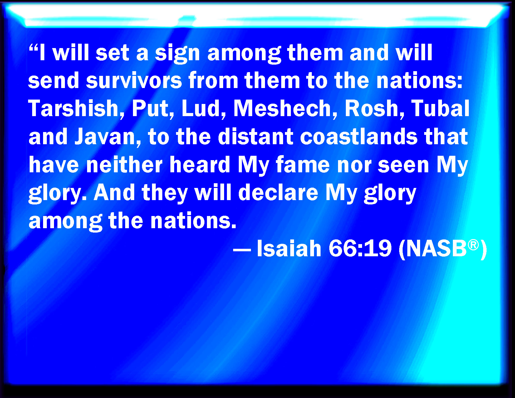 Bible Verse Slide Isaiah 66:19 And I will set a sign among them, and I will send those that escape of them to the nations, to Tarshish, Pul, and Lud, that draw the bow, to Tubal, and Javan, to the isles afar off, that have not heard my fame, neither have seen my glory; and they shall declare my glory among the Gentiles. KJV: And I will set a sign among them, and I will send those that escape of them unto the nations, to Tarshish, Pul, and Lud, that draw the bow, to Tubal, and Javan, to the isles afar off, that have not heard my fame, neither have seen my glory; and they shall declare my glory among the Gentiles. DRB: And I will set a sign among them, and I will send of them that shall be saved, to the Gentiles into the sea, into Africa, and Lydia them that draw the bow: into Italy, and Greece, to the islands afar off, to them that have not heard of me, and have not seen my glory. And they shall declare my glory to the Gentiles: DBT: And I will set a sign among them, and I will send those that escape of them unto the nations, to Tarshish, Pul, and Lud, that draw the bow; to Tubal and Javan, to the isles afar off, that have not heard my fame, neither have seen my glory: and they shall declare my glory among the nations. ERV: And I will set a sign among them, and I will send such as escape of them unto the nations, to Tarshish, Pul and Lud, that draw the bow, to Tubal and Javan, to the isles afar off, that have not heard my fame, neither have seen my glory; and they shall declare my glory among the nations. WBT: And I will set a sign among them, and I will send those that escape of them to the nations, to Tarshish, Pul, and Lud, that draw the bow, to Tubal, and Javan, to the isles afar off, that have not heard my fame, neither have seen my glory; and they shall declare my glory among the Gentiles. WEB: "I will set a sign among them, and I will send such as escape of them to the nations, to Tarshish, Pul, and Lud, who draw the bow, to Tubal and Javan, to the islands afar off, who have not heard my fame, neither have seen my glory; and they shall declare my glory among the nations. YLT: And I have set among them a sign, And have sent out of them those escaping unto the nations, (Tarshish, Pul, and Lud, drawing bow, Tubal and Javan, the isles that are far off,) Who have not heard My fame, nor seen Mine honour, And they have declared Mine honour among nations.Links Isaiah 66:19 NIV • Isaiah 66:19 NLT • Isaiah 66:19 ESV • Isaiah 66:19 NASB • Isaiah 66:19 KJV • Isaiah 66:19 Interlinear • Isaiah 66:19 Commentaries • Isaiah 66:19 Parallel Texts • Isaiah 66:19 Bible Apps • Isaiah 66:19 Parallel • Bible Hub |