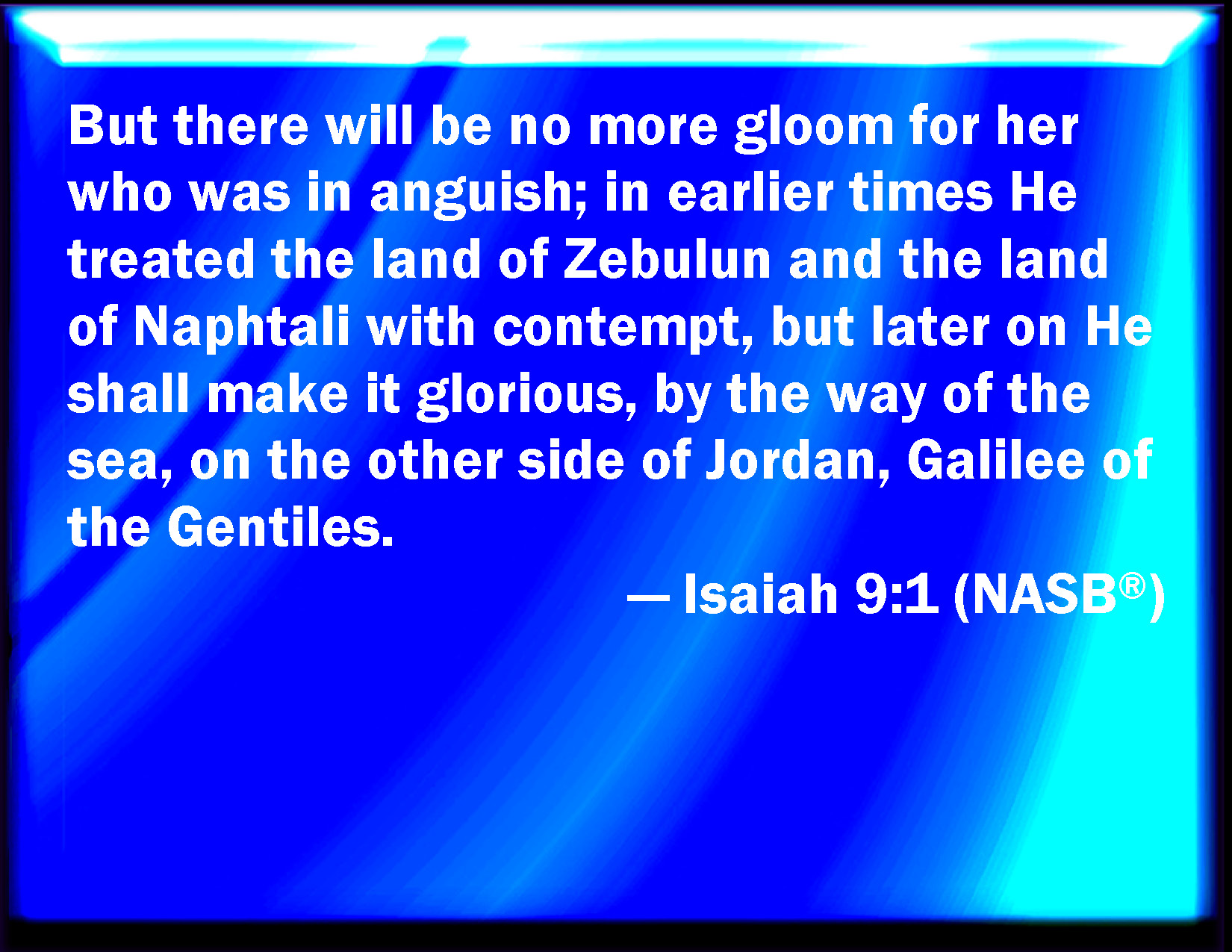 Bible Verse Slide Isaiah 9:1 Nevertheless the dimness shall not be such as was in her vexation, when at the first he lightly afflicted the land of Zebulun and the land of Naphtali, and afterward did more grievously afflict her by the way of the sea, beyond Jordan, in Galilee of the nations. KJV: Nevertheless the dimness shall not be such as was in her vexation, when at the first he lightly afflicted the land of Zebulun and the land of Naphtali, and afterward did more grievously afflict her by the way of the sea, beyond Jordan, in Galilee of the nations. DRB: AT the first time the land of Zabulon, and the land of Nephtali was lightly touched: and at the last the way of the sea beyond the Jordan of the Galilee of the Gentiles was heavily loaded. DBT: Nevertheless the darkness shall not be as when the distress was in the land, at the time he at first lightly, and afterwards heavily, visited the land of Zebulun and the land of Naphtali, the way of the sea, beyond the Jordan, Galilee of the nations: ERV: But there shall be no gloom to her that was in anguish. In the former time he brought into contempt the land of Zebulun and the land of Naphtali, but in the latter time hath he made it glorious, by the way of the sea, beyond Jordan, Galilee of the nations. WBT: Nevertheless the dimness shall not be such as was in her distress, when at the first he lightly afflicted the land of Zebulun, and the land of Naphtali, and afterward did more grievously afflict her by the way of the sea, beyond Jordan, in Galilee of the nations. WEB: But there shall be no more gloom for her who was in anguish. In the former time, he brought into contempt the land of Zebulun and the land of Naphtali; but in the latter time he has made it glorious, by the way of the sea, beyond the Jordan, Galilee of the nations. YLT: As the former time made light The land of Zebulun and the land of Naphtali, So the latter hath honoured the way of the sea, Beyond the Jordan, Galilee of the nations.Links Isaiah 9:1 NIV • Isaiah 9:1 NLT • Isaiah 9:1 ESV • Isaiah 9:1 NASB • Isaiah 9:1 KJV • Isaiah 9:1 Interlinear • Isaiah 9:1 Commentaries • Isaiah 9:1 Parallel Texts • Isaiah 9:1 Bible Apps • Isaiah 9:1 Parallel • Bible Hub |