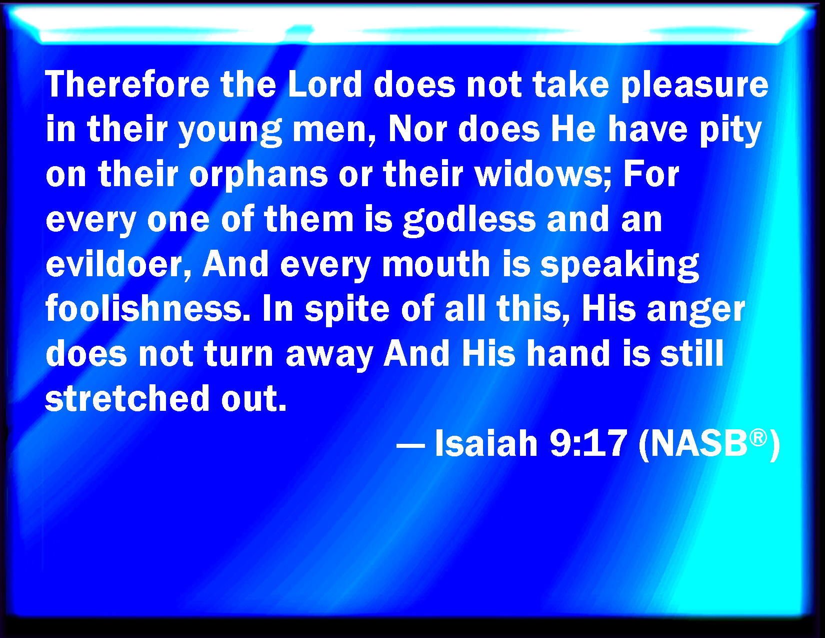 Bible Verse Slide Isaiah 9:17 Therefore the LORD shall have no joy in their young men, neither shall have mercy on their fatherless and widows: for every one is an hypocrite and an evildoer, and every mouth speaks folly. For all this his anger is not turned away, but his hand is stretched out still. KJV: Therefore the Lord shall have no joy in their young men, neither shall have mercy on their fatherless and widows: for every one is an hypocrite and an evildoer, and every mouth speaketh folly. For all this his anger is not turned away, but his hand is stretched out still. DRB: Therefore the Lord shell have no joy in their young men: neither shall he have mercy on their fatherless, and widows: for every one is a hypocrite and wicked, and every mouth hath spoken folly. For all this his indignation is not turned away, but his bend is stretched out still. DBT: Therefore the Lord will not rejoice in their young men, neither will he have mercy on their fatherless and on their widows; for every one is a hypocrite and an evildoer, and every mouth speaketh folly. For all this his anger is not turned away, and his hand is stretched out still. ERV: Therefore the Lord shall not rejoice over their young men, neither shall he have compassion on their fatherless and widows: for every one is profane and an evil-doer, and every mouth speaketh folly. For all this his anger is not turned away, but his hand is stretched out still. WBT: Therefore the Lord will have no joy in their young men, neither will have mercy on their fatherless and widows: for every one is a hypocrite and an evil-doer, and every mouth speaketh folly. For all this his anger is not turned away, but his hand is stretched out still. WEB: Therefore the Lord will not rejoice over their young men, neither will he have compassion on their fatherless and widows; for everyone is profane and an evildoer, and every mouth speaks folly. For all this his anger is not turned away, but his hand is stretched out still. YLT: Therefore, over its young men the Lord rejoiceth not, And its orphans, and its widows He pitieth not, For every one is profane, and an evil doer, And every mouth is speaking folly. With all this not turned back hath His anger, And still His hand is stretched out.Links Isaiah 9:17 NIV • Isaiah 9:17 NLT • Isaiah 9:17 ESV • Isaiah 9:17 NASB • Isaiah 9:17 KJV • Isaiah 9:17 Interlinear • Isaiah 9:17 Commentaries • Isaiah 9:17 Parallel Texts • Isaiah 9:17 Bible Apps • Isaiah 9:17 Parallel • Bible Hub |