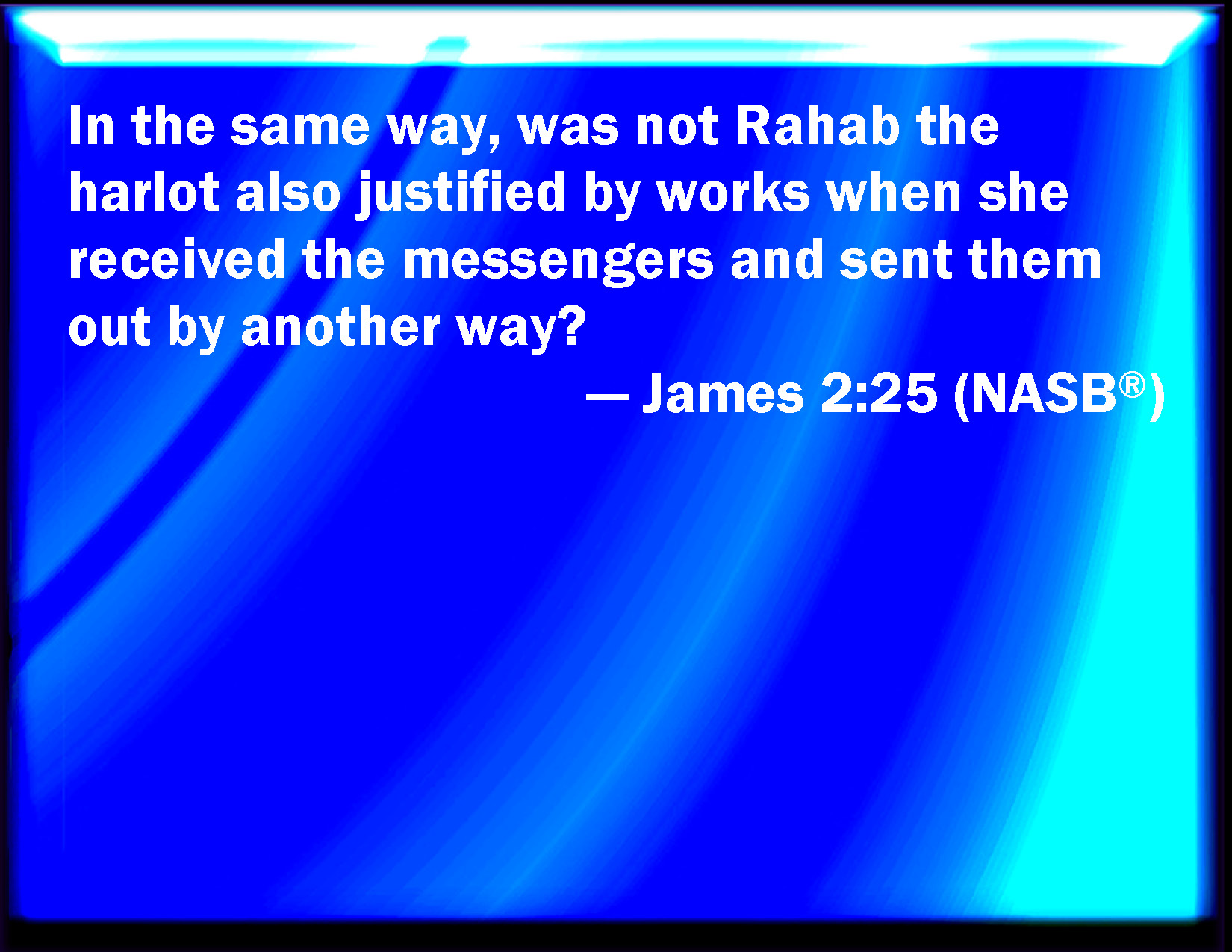 Bible Verse Slide James 2:25 Likewise also was not Rahab the harlot justified by works, when she had received the messengers, and had sent them out another way? KJV: Likewise also was not Rahab the harlot justified by works, when she had received the messengers, and had sent them out another way? DRB: And in like manner also Rahab the harlot, was not she justified by works, receiving the messengers, and sending them out another way? DBT: But was not in like manner also Rahab the harlot justified on the principle of works, when she had received the messengers and put them forth by another way? ERV: And in like manner was not also Rahab the harlot justified by works, in that she received the messengers, and sent them out another way? WBT: Likewise also was not Rahab the harlot justified by works, when she had received the messengers, and had sent them out another way? WEB: In the same way, wasn't Rahab the prostitute also justified by works, in that she received the messengers, and sent them out another way? YLT: and in like manner also Rahab the harlot — was she not out of works declared righteous, having received the messengers, and by another way having sent forth?Links James 2:25 NIV • James 2:25 NLT • James 2:25 ESV • James 2:25 NASB • James 2:25 KJV • James 2:25 Interlinear • James 2:25 Commentaries • James 2:25 Parallel Texts • James 2:25 Bible Apps • James 2:25 Parallel • Bible Hub |