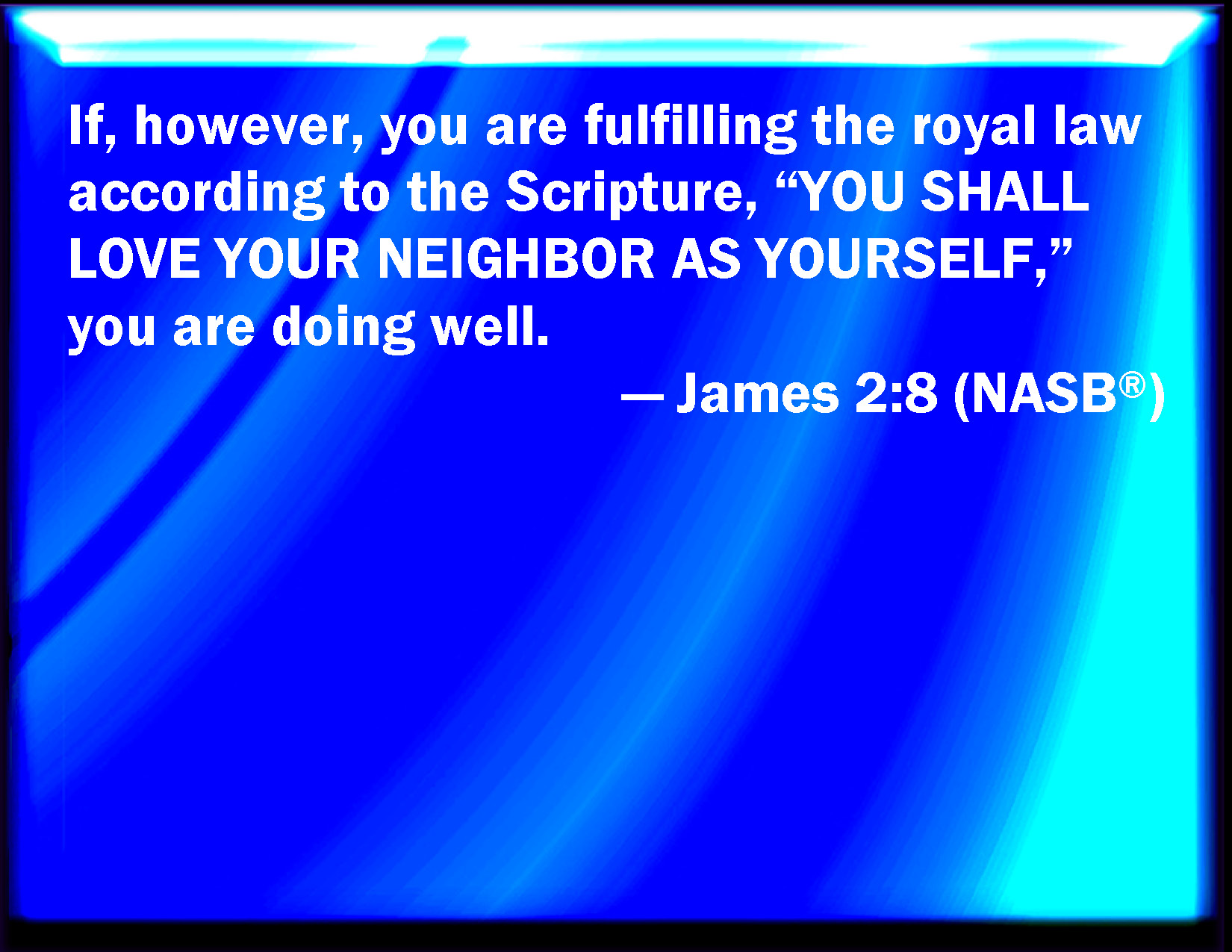 Bible Verse Slide James 2:8 If you fulfill the royal law according to the scripture, You shall love your neighbor as yourself, you do well: KJV: If ye fulfil the royal law according to the scripture, Thou shalt love thy neighbour as thyself, ye do well: DRB: If then you fulfil the royal law, according to the scriptures, Thou shalt love thy neighbour as thyself; you do well. DBT: If indeed ye keep the royal law according to the scripture, Thou shalt love thy neighbour as thyself, ye do well. ERV: Howbeit if ye fulfill the royal law, according to the scripture, Thou shalt love thy neighbour as thyself, ye do well: WBT: If ye fulfill the royal law according to the scripture, Thou shalt love thy neighbor as thyself, ye do well: WEB: However, if you fulfill the royal law, according to the Scripture, "You shall love your neighbor as yourself," you do well. YLT: If, indeed, royal law ye complete, according to the Writing, 'Thou shalt love thy neighbour as thyself,' — ye do well;Links James 2:8 NIV • James 2:8 NLT • James 2:8 ESV • James 2:8 NASB • James 2:8 KJV • James 2:8 Interlinear • James 2:8 Commentaries • James 2:8 Parallel Texts • James 2:8 Bible Apps • James 2:8 Parallel • Bible Hub |