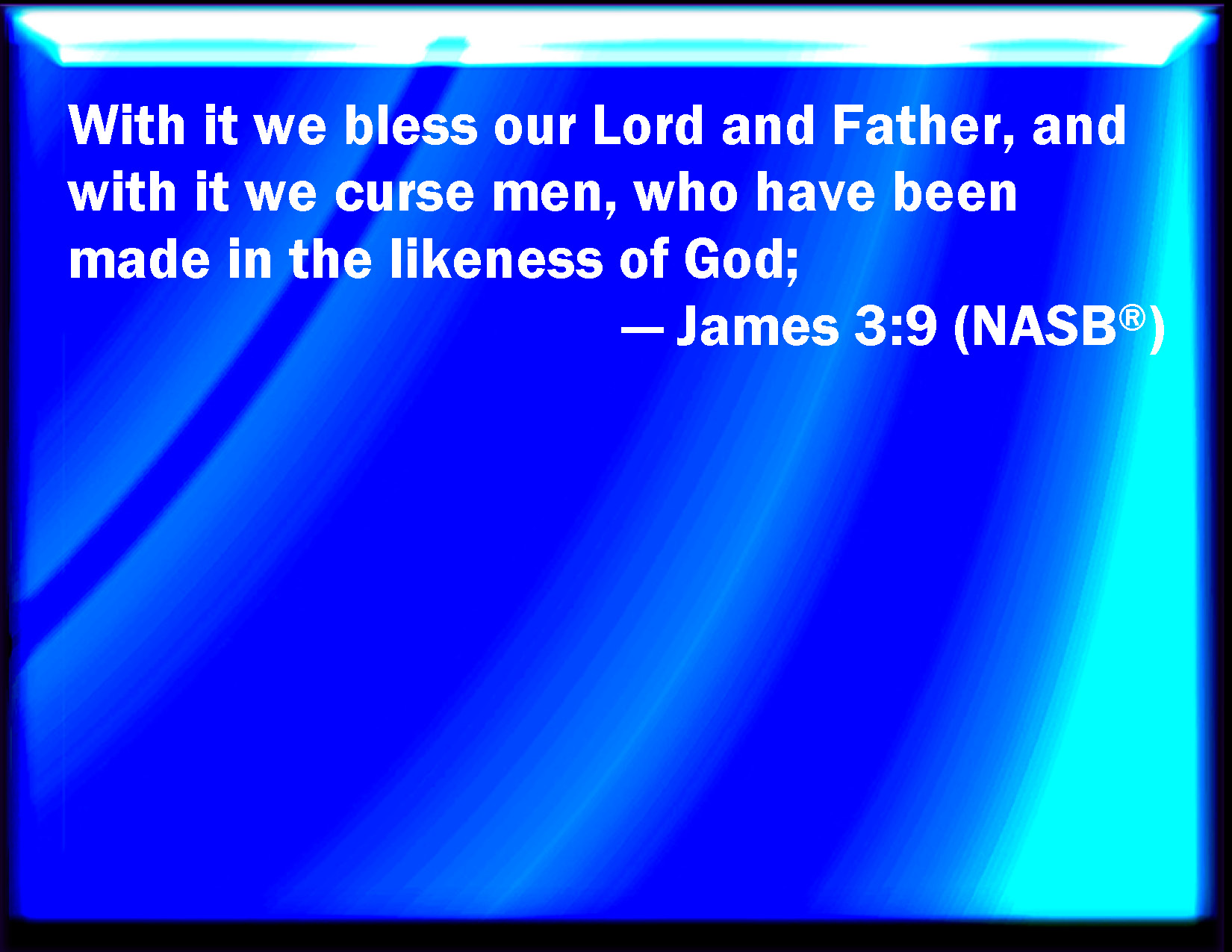 Bible Verse Slide James 3:9 Therewith bless we God, even the Father; and therewith curse we men, which are made after the similitude of God. KJV: Therewith bless we God, even the Father; and therewith curse we men, which are made after the similitude of God. DRB: By it we bless God and the Father: and by it we curse men, who are made after the likeness of God. DBT: Therewith bless we the Lord and Father, and therewith curse we men made after the likeness of God. ERV: Therewith bless we the Lord and Father; and therewith curse we men, which are made after the likeness of God: WBT: With this we bless God, even the Father; and with this we curse men, who are made after the similitude of God. WEB: With it we bless our God and Father, and with it we curse men, who are made in the image of God. YLT: with it we do bless the God and Father, and with it we do curse the men made according to the similitude of God;Links James 3:9 NIV • James 3:9 NLT • James 3:9 ESV • James 3:9 NASB • James 3:9 KJV • James 3:9 Interlinear • James 3:9 Commentaries • James 3:9 Parallel Texts • James 3:9 Bible Apps • James 3:9 Parallel • Bible Hub |