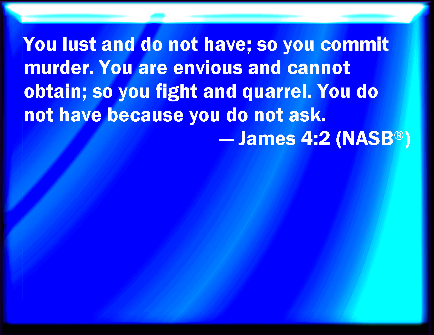 Bible Verse Slide James 4:2 You lust, and have not: you kill, and desire to have, and cannot obtain: you fight and war, yet you have not, because you ask not. KJV: Ye lust, and have not: ye kill, and desire to have, and cannot obtain: ye fight and war, yet ye have not, because ye ask not. DRB: You covet, and have not: you kill, and envy, and can not obtain. You contend and war, and you have not, because you ask not. DBT: Ye lust and have not: ye kill and are full of envy, and cannot obtain; ye fight and war; ye have not because ye ask not. ERV: Ye lust, and have not: ye kill, and covet, and cannot obtain: ye fight and war; ye have not, because ye ask not. WBT: Ye lust and have not: ye kill, and desire to have, and cannot obtain: ye fight and war, yet ye have not, because ye ask not. WEB: You lust, and don't have. You kill, covet, and can't obtain. You fight and make war. You don't have, because you don't ask. YLT: ye desire, and ye have not; ye murder, and are zealous, and are not able to attain; ye fight and war, and ye have not, because of your not asking;Links James 4:2 NIV • James 4:2 NLT • James 4:2 ESV • James 4:2 NASB • James 4:2 KJV • James 4:2 Interlinear • James 4:2 Commentaries • James 4:2 Parallel Texts • James 4:2 Bible Apps • James 4:2 Parallel • Bible Hub |