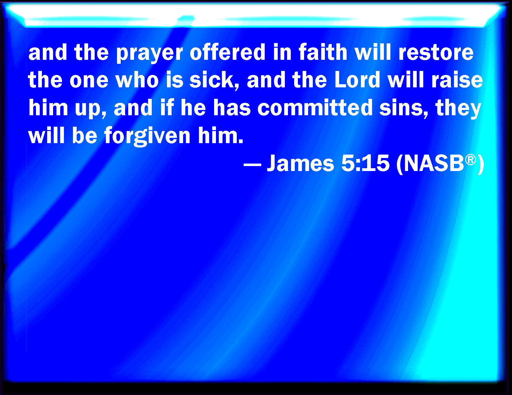 Bible Verse Slide James 5:15 And the prayer of faith shall save the sick, and the Lord shall raise him up; and if he have committed sins, they shall be forgiven him. KJV: And the prayer of faith shall save the sick, and the Lord shall raise him up; and if he have committed sins, they shall be forgiven him. DRB: And the prayer of faith shall save the sick man: and the Lord shall raise him up: and if he be in sins, they shall be forgiven him. DBT: and the prayer of faith shall heal the sick, and the Lord shall raise him up; and if he be one who has committed sins, it shall be forgiven him. ERV: and the prayer of faith shall save him that is sick, and the Lord shall raise him up; and if he have committed sins, it shall be forgiven him. WBT: And the prayer of faith will save the sick, and the Lord will raise him up; and if he hath committed sins, they will be forgiven him. WEB: and the prayer of faith will heal him who is sick, and the Lord will raise him up. If he has committed sins, he will be forgiven. YLT: and the prayer of the faith shall save the distressed one, and the Lord shall raise him up, and if sins he may have committed, they shall be forgiven to him.Links James 5:15 NIV • James 5:15 NLT • James 5:15 ESV • James 5:15 NASB • James 5:15 KJV • James 5:15 Interlinear • James 5:15 Commentaries • James 5:15 Parallel Texts • James 5:15 Bible Apps • James 5:15 Parallel • Bible Hub |