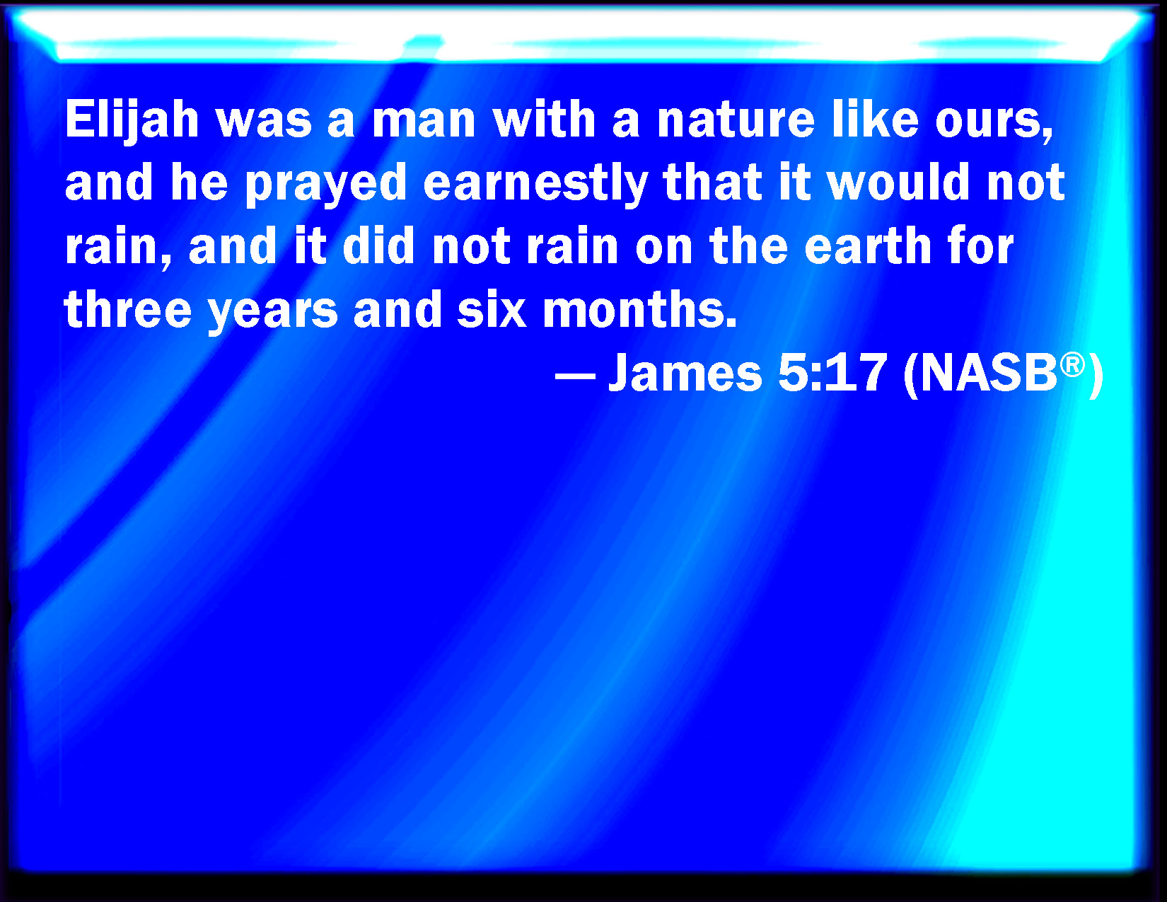 Bible Verse Slide James 5:17 Elias was a man subject to like passions as we are, and he prayed earnestly that it might not rain: and it rained not on the earth by the space of three years and six months. KJV: Elias was a man subject to like passions as we are, and he prayed earnestly that it might not rain: and it rained not on the earth by the space of three years and six months. DRB: Elias was a man passible like unto us: and with prayer he prayed that it might not rain upon the earth, and it rained not for three years and six months. DBT: Elias was a man of like passions to us, and he prayed with prayer that it should not rain; and it did not rain upon the earth three years and six months; ERV: Elijah was a man of like passions with us, and he prayed fervently that it might not rain; and it rained not on the earth for three years and six months. WBT: Elijah was a man subject to like passions as we are, and he prayed earnestly that it might not rain: and it rained not on the earth by the space of three years and six months. WEB: Elijah was a man with a nature like ours, and he prayed earnestly that it might not rain, and it didn't rain on the earth for three years and six months. YLT: Elijah was a man like affected as we, and with prayer he did pray — not to rain, and it did not rain upon the land three years and six months;Links James 5:17 NIV • James 5:17 NLT • James 5:17 ESV • James 5:17 NASB • James 5:17 KJV • James 5:17 Interlinear • James 5:17 Commentaries • James 5:17 Parallel Texts • James 5:17 Bible Apps • James 5:17 Parallel • Bible Hub |