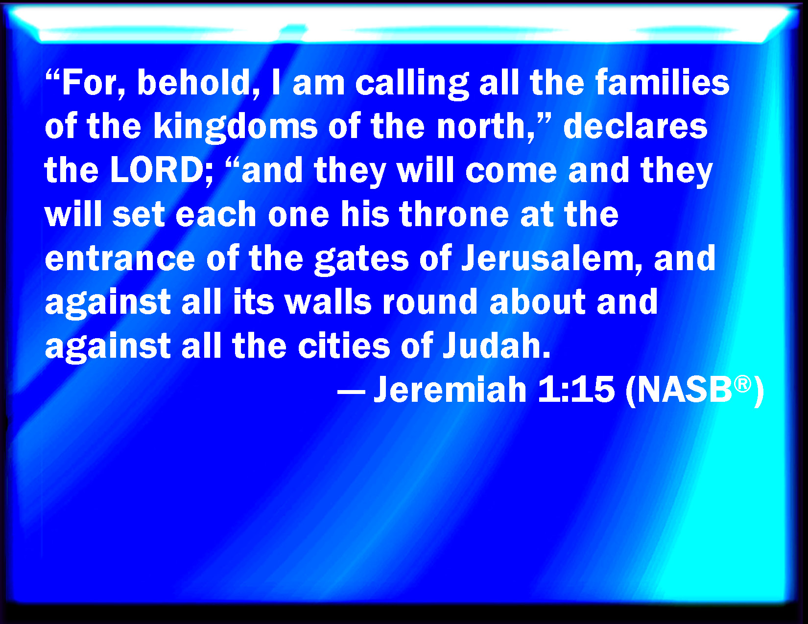 Bible Verse Slide Jeremiah 1:15 For, see, I will call all the families of the kingdoms of the north, said the LORD; and they shall come, and they shall set every one his throne at the entering of the gates of Jerusalem, and against all the walls thereof round about, and against all the cities of Judah. KJV: For, lo, I will call all the families of the kingdoms of the north, saith the LORD; and they shall come, and they shall set every one his throne at the entering of the gates of Jerusalem, and against all the walls thereof round about, and against all the cities of Judah. DRB: For behold I will call together all the families of the kingdoms of the north: saith the Lord: and they shall come, and shall set every one his throne in the entrance of the gates of Jerusalem, and upon all the walls thereof round about, and upon all the cities of Juda, DBT: For behold, I am calling all the families of the kingdoms of the north, saith Jehovah, and they shall come, and they shall set every one his throne at the entering of the gates of Jerusalem, and against all the walls thereof round about, and against all the cities of Judah: ERV: For, lo, I will call all the families of the kingdoms of the north, saith the LORD; and they shall come, and they shall set every one his throne at the entering of the gates of Jerusalem, and against all the walls thereof round about, and against all the cities of Judah. WBT: For lo, I will call all the families of the kingdoms of the north, saith the LORD; and they shall come, and they shall set every one his throne at the entrance of the gates of Jerusalem, and against all its walls around, and against all the cities of Judah. WEB: For, behold, I will call all the families of the kingdoms of the north," says Yahweh; "and they shall come, and they shall each set his throne at the entrance of the gates of Jerusalem, and against all its walls all around, and against all the cities of Judah. YLT: For, lo, I am calling for all families of the kingdoms of the north, — an affirmation of Jehovah — and they have come, and put each his throne at the opening of the gates of Jerusalem, and by its walls round about, and by all cities of Judah.Links Jeremiah 1:15 NIV • Jeremiah 1:15 NLT • Jeremiah 1:15 ESV • Jeremiah 1:15 NASB • Jeremiah 1:15 KJV • Jeremiah 1:15 Interlinear • Jeremiah 1:15 Commentaries • Jeremiah 1:15 Parallel Texts • Jeremiah 1:15 Bible Apps • Jeremiah 1:15 Parallel • Bible Hub |