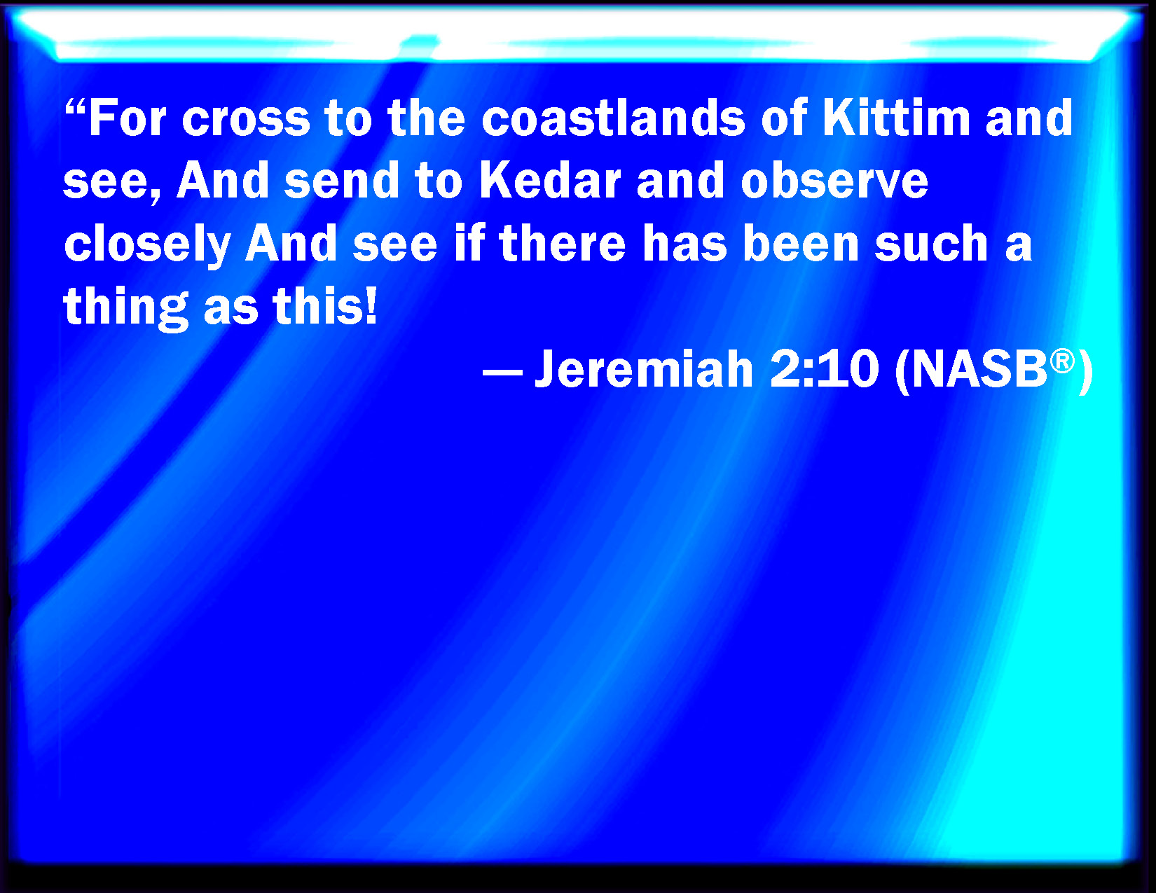 Bible Verse Slide Jeremiah 2:10 For pass over the isles of Chittim, and see; and send to Kedar, and consider diligently, and see if there be such a thing. KJV: For pass over the isles of Chittim, and see; and send unto Kedar, and consider diligently, and see if there be such a thing. DRB: Pass over to the isles of Cethim, and see: and send into Cedar, and consider diligently: and see if there hath been done any thing like this. DBT: For pass over to the isles of Chittim, and see; and send unto Kedar, and consider diligently, and see if there have been such a thing. ERV: For pass over to the isles of Kittim, and see; and send unto Kedar, and consider diligently; and see if there hath been such a thing. WBT: For pass over the isles of Chittim, and see; and send to Kedar, and consider diligently, and see if there is such a thing. WEB: For pass over to the islands of Kittim, and see; and send to Kedar, and consider diligently; and see if there has been such a thing. YLT: For, pass to the isles of Chittim, and see, And to Kedar send, and consider well, And see if there hath been like this:Links Jeremiah 2:10 NIV • Jeremiah 2:10 NLT • Jeremiah 2:10 ESV • Jeremiah 2:10 NASB • Jeremiah 2:10 KJV • Jeremiah 2:10 Interlinear • Jeremiah 2:10 Commentaries • Jeremiah 2:10 Parallel Texts • Jeremiah 2:10 Bible Apps • Jeremiah 2:10 Parallel • Bible Hub |