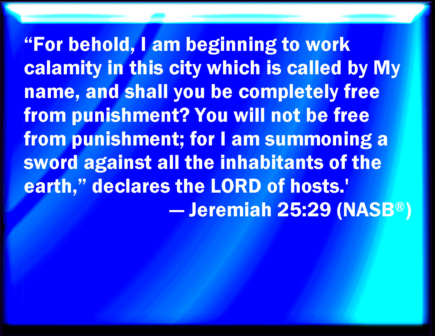 Bible Verse Slide Jeremiah 25:29 For, see, I begin to bring evil on the city which is called by my name, and should you be utterly unpunished? You shall not be unpunished: for I will call for a sword on all the inhabitants of the earth, said the LORD of hosts. KJV: For, lo, I begin to bring evil on the city which is called by my name, and should ye be utterly unpunished? Ye shall not be unpunished: for I will call for a sword upon all the inhabitants of the earth, saith the LORD of hosts. DRB: For behold I begin to bring evil on the city wherein my name is called upon: and shall you be as innocent and escape free? you shall not escape free: for I will call for the sword upon all the inhabitants of the earth, saith the Lord of hosts. DBT: For behold, I begin to bring evil on the city that is called by my name, and should ye be altogether unpunished? Ye shall not be unpunished; for I call for a sword upon all the inhabitants of the earth, saith Jehovah of hosts. ERV: For, lo, I begin to work evil at the city which is called by my name, and should ye be utterly unpunished? Ye shall not be unpunished: for I will call for a sword upon all the inhabitants of the earth, saith the LORD of hosts. WBT: For lo, I begin to bring evil on the city which is called by my name, and should ye be utterly unpunished? Ye shall not be unpunished: for I will call for a sword upon all the inhabitants of the earth, saith the LORD of hosts. WEB: For, behold, I begin to work evil at the city which is called by my name; and should you be utterly unpunished? You shall not be unpunished; for I will call for a sword on all the inhabitants of the earth, says Yahweh of Armies. YLT: For lo, in the city over which My name is called, I am beginning to do evil, And ye — ye are entirely acquitted! Ye are not acquitted, for a sword I am proclaiming, For all inhabitants of the land, An affirmation of Jehovah of Hosts.Links Jeremiah 25:29 NIV • Jeremiah 25:29 NLT • Jeremiah 25:29 ESV • Jeremiah 25:29 NASB • Jeremiah 25:29 KJV • Jeremiah 25:29 Interlinear • Jeremiah 25:29 Commentaries • Jeremiah 25:29 Parallel Texts • Jeremiah 25:29 Bible Apps • Jeremiah 25:29 Parallel • Bible Hub |