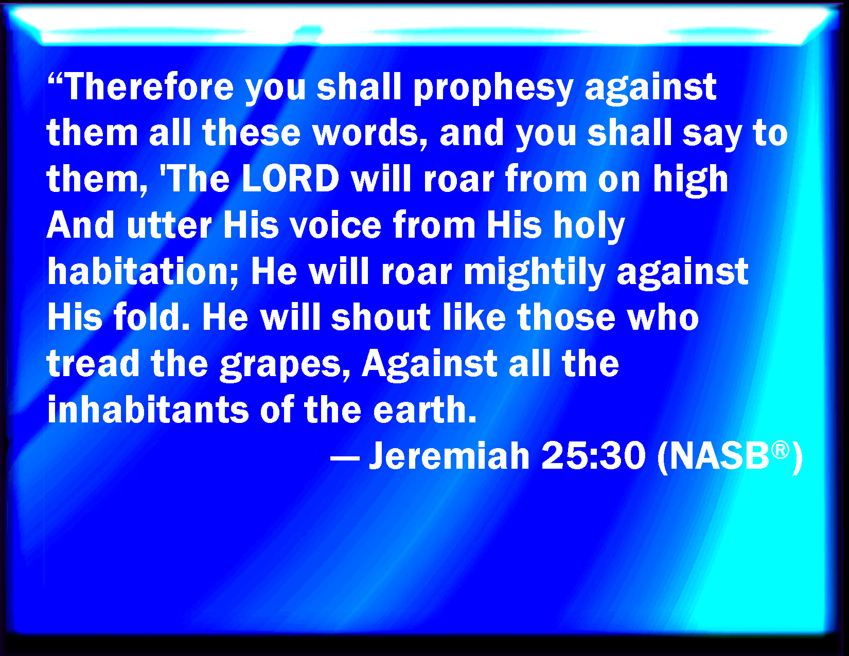 Bible Verse Slide Jeremiah 25:30 Therefore prophesy you against them all these words, and say to them, The LORD shall roar from on high, and utter his voice from his holy habitation; he shall mightily roar on his habitation; he shall give a shout, as they that tread the grapes, against all the inhabitants of the earth. KJV: Therefore prophesy thou against them all these words, and say unto them, The LORD shall roar from on high, and utter his voice from his holy habitation; he shall mightily roar upon his habitation; he shall give a shout, as they that tread the grapes, against all the inhabitants of the earth. DRB: And thou shalt prophesy unto them all these words, and thou shalt say to them: The Lord shall roar from on high, and shall utter his voice from his holy habitation: roaring he shall roar upon the place of his beauty: the shout as it were of them that tread grapes shall be given out against all the inhabitants of the earth. DBT: And thou, prophesy unto them all these words, and say unto them, Jehovah will roar from on high, and utter his voice from his holy habitation; he will mightily roar upon his dwelling-place, he will give a shout, as they that tread the vintage, against all the inhabitants of the earth. ERV: Therefore prophesy thou against them all these words, and say unto them, The LORD shall roar from on high, and utter his voice from his holy habitation; he shall mightily roar against his fold; he shall give a shout, as they that tread the grapes, against all the inhabitants of the earth. WBT: Therefore prophesy thou against them all these words, and say to them, The LORD shall roar from on high, and utter his voice from his holy habitation; he shall mightily roar upon his habitation; he shall give a shout, as they that tread the grapes, against all the inhabitants of the earth. WEB: Therefore prophesy you against them all these words, and tell them, Yahweh will roar from on high, and utter his voice from his holy habitation; he will mightily roar against his fold; he will give a shout, as those who tread [the grapes], against all the inhabitants of the earth. YLT: And thou, thou dost prophesy unto them all these words, and hast said unto them: Jehovah from the high place doth roar, And from His holy habitation giveth forth His voice, He surely roareth for His habitation, A shout as of treaders down, God answereth all the inhabitants of the land,Links Jeremiah 25:30 NIV • Jeremiah 25:30 NLT • Jeremiah 25:30 ESV • Jeremiah 25:30 NASB • Jeremiah 25:30 KJV • Jeremiah 25:30 Interlinear • Jeremiah 25:30 Commentaries • Jeremiah 25:30 Parallel Texts • Jeremiah 25:30 Bible Apps • Jeremiah 25:30 Parallel • Bible Hub |