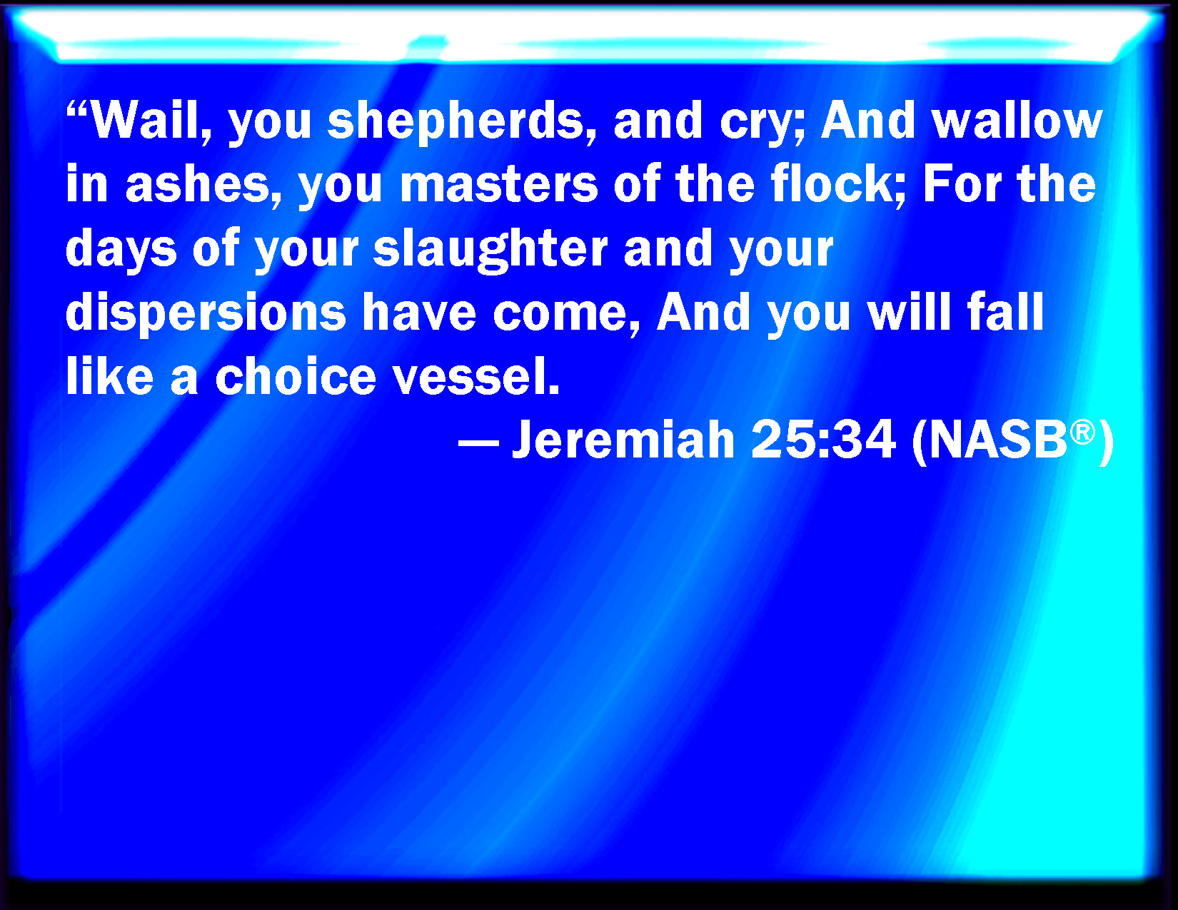 Bible Verse Slide Jeremiah 25:34 Howl, you shepherds, and cry; and wallow yourselves in the ashes, you principal of the flock: for the days of your slaughter and of your dispersions are accomplished; and you shall fall like a pleasant vessel. KJV: Howl, ye shepherds, and cry; and wallow yourselves in the ashes, ye principal of the flock: for the days of your slaughter and of your dispersions are accomplished; and ye shall fall like a pleasant vessel. DRB: Howl, ye shepherds, and cry: and sprinkle yourselves with ashes, ye leaders of the flock: for the days of your slaughter and your dispersion are accomplished, and you shall fall like precious vessels. DBT: Howl, ye shepherds, and cry; and wallow yourselves in the dust, noble ones of the flock: for the days of your slaughter are accomplished, and I will disperse you; and ye shall fall like a precious vessel. ERV: Howl, ye shepherds, and cry; and wallow yourselves in ashes, ye principal of the flock: for the days of your slaughter are fully come, and I will break you in pieces, and ye shall fall like a pleasant vessel. WBT: Howl, ye shepherds, and cry; and wallow yourselves in the ashes, ye principal of the flock: for the days of your slaughter and of your dispersions are accomplished; and ye shall fall like a pleasant vessel. WEB: Wail, you shepherds, and cry; and wallow [in ashes], you principal of the flock; for the days of your slaughter and of your dispersions are fully come, and you shall fall like a goodly vessel. YLT: Howl, ye shepherds, and cry, And roll yourselves, ye honourable of the flock, For full have been your days, For slaughtering, and for your scatterings, And ye have fallen as a desirable vessel.Links Jeremiah 25:34 NIV • Jeremiah 25:34 NLT • Jeremiah 25:34 ESV • Jeremiah 25:34 NASB • Jeremiah 25:34 KJV • Jeremiah 25:34 Interlinear • Jeremiah 25:34 Commentaries • Jeremiah 25:34 Parallel Texts • Jeremiah 25:34 Bible Apps • Jeremiah 25:34 Parallel • Bible Hub |