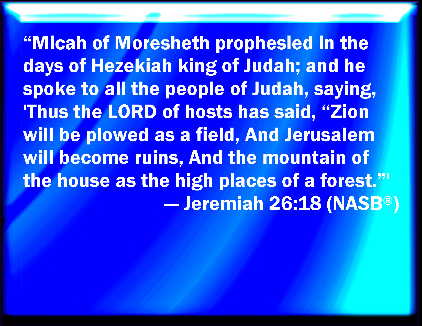 Bible Verse Slide Jeremiah 26:18 Micah the Morasthite prophesied in the days of Hezekiah king of Judah, and spoke to all the people of Judah, saying, Thus said the LORD of hosts; Zion shall be plowed like a field, and Jerusalem shall become heaps, and the mountain of the house as the high places of a forest. KJV: Micah the Morasthite prophesied in the days of Hezekiah king of Judah, and spake to all the people of Judah, saying, Thus saith the LORD of hosts; Zion shall be plowed like a field, and Jerusalem shall become heaps, and the mountain of the house as the high places of a forest. DRB: Micheas of Morasthi was a prophet in the days of Ezechias king of Juda, and he spoke to all the people of Juda, saying: Thus saith the Lord of hosts: Sion shall be ploughed like a field, and Jerusalem shall be a heap of stones: and the mountain of the house the high places of woods. DBT: Micah the Morasthite prophesied in the days of Hezekiah king of Judah, and spoke to all the people of Judah, saying, Thus saith Jehovah of hosts: Zion shall be ploughed as a field, and Jerusalem shall become heaps, and the mountain of the house as the high places of a forest. ERV: Micaiah the Morashtite prophesied in the days of Hezekiah king of Judah; and he spake to all the people of Judah, saying, Thus saith the LORD of hosts: Zion shall be plowed as a field, and Jerusalem shall become heaps, and the mountain of the house as the high places of a forest. WBT: Micah the Morasthite prophesied in the days of Hezekiah king of Judah, and spoke to all the people of Judah, saying, Thus saith the LORD of hosts; Zion shall be plowed like a field, and Jerusalem shall become heaps, and the mountain of the house as the high places of the forest. WEB: Micah the Morashtite prophesied in the days of Hezekiah king of Judah; and he spoke to all the people of Judah, saying, Thus says Yahweh of Armies: Zion shall be plowed as a field, and Jerusalem shall become heaps, and the mountain of the house as the high places of a forest. YLT: 'Micah the Morashtite hath been prophesying in the days of Hezekiah king of Judah, and he saith unto all the people of Judah, saying: Thus said Jehovah of Hosts: Zion is a plowed field, and Jerusalem is heaps, And the mountain of the house is for high places of a forest.Links Jeremiah 26:18 NIV • Jeremiah 26:18 NLT • Jeremiah 26:18 ESV • Jeremiah 26:18 NASB • Jeremiah 26:18 KJV • Jeremiah 26:18 Interlinear • Jeremiah 26:18 Commentaries • Jeremiah 26:18 Parallel Texts • Jeremiah 26:18 Bible Apps • Jeremiah 26:18 Parallel • Bible Hub |
