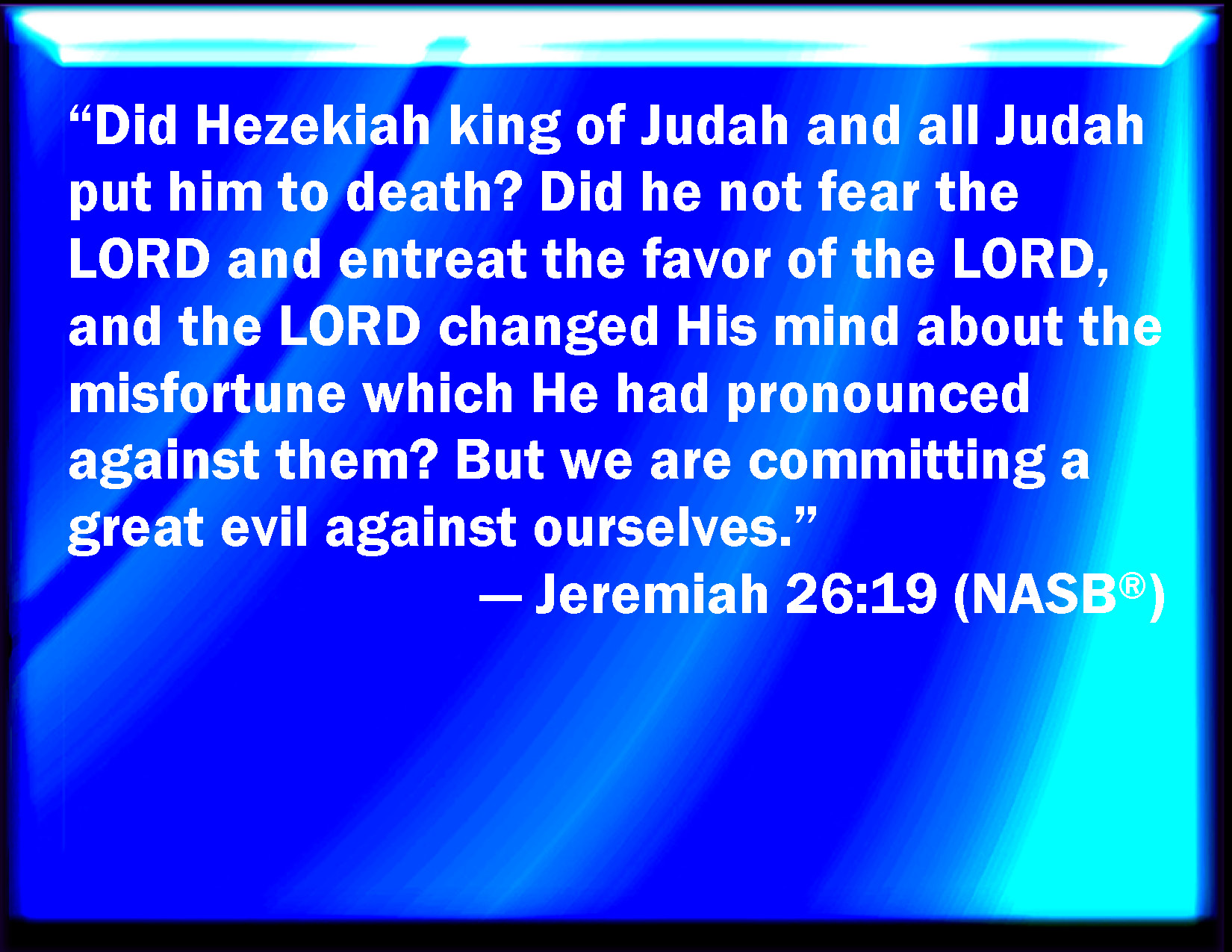 Did Hezekiah king of Judah and all Judah put him at all to death? Did he not fear Jehovah, and supplicate Jehovah, and Jehovah repented him of the evil that he had pronounced against them? And we should be doing a great evil against our souls.