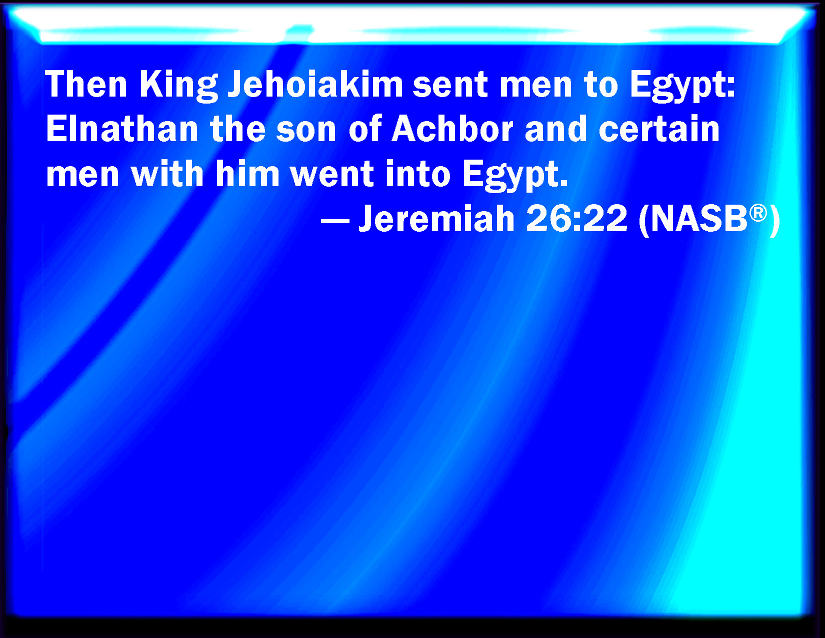 Bible Verse Slide Jeremiah 26:22 And Jehoiakim the king sent men into Egypt, namely, Elnathan the son of Achbor, and certain men with him into Egypt. KJV: And Jehoiakim the king sent men into Egypt, namely, Elnathan the son of Achbor, and certain men with him into Egypt. DRB: And king Joakim sent men into Egypt, Elnathan the son of Achobor, and men with him into Egypt. DBT: And Jehoiakim the king sent men into Egypt, Elnathan the son of Achbor, and men with him, into Egypt; ERV: and Jehoiakim the king sent men into Egypt, namely, Elnathan the son of Achbor, and certain men with him, into Egypt: WBT: And Jehoiakim the king sent men into Egypt, namely, Elnathan the son of Achbor, and certain men with him into Egypt. WEB: and Jehoiakim the king sent men into Egypt, [namely], Elnathan the son of Achbor, and certain men with him, into Egypt; YLT: And the king Jehoiakim sendeth men to Egypt — Elnathan son of Achbor, and men with him unto Egypt — Links Jeremiah 26:22 NIV • Jeremiah 26:22 NLT • Jeremiah 26:22 ESV • Jeremiah 26:22 NASB • Jeremiah 26:22 KJV • Jeremiah 26:22 Interlinear • Jeremiah 26:22 Commentaries • Jeremiah 26:22 Parallel Texts • Jeremiah 26:22 Bible Apps • Jeremiah 26:22 Parallel • Bible Hub |