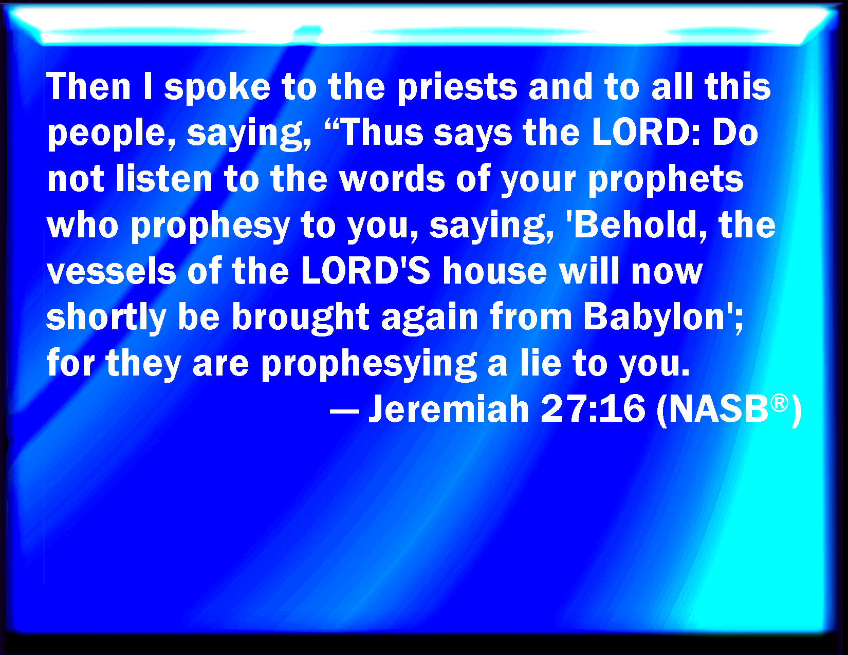 Bible Verse Slide Jeremiah 27:16 Also I spoke to the priests and to all this people, saying, Thus said the LORD; Listen not to the words of your prophets that prophesy to you, saying, Behold, the vessels of the LORD's house shall now shortly be brought again from Babylon: for they prophesy a lie to you. KJV: Also I spake to the priests and to all this people, saying, Thus saith the LORD; Hearken not to the words of your prophets that prophesy unto you, saying, Behold, the vessels of the LORD'S house shall now shortly be brought again from Babylon: for they prophesy a lie unto you. DRB: I spoke also to the priests, and to this people, saying: Thus saith the Lord: Hearken not to the words of your prophets, that prophesy to you, saying: Behold the vessels of the Lord shall now in a short time be brought again from Babylon: for they prophesy a lie unto you. DBT: And I spoke to the priests and to all this people, saying, Thus saith Jehovah: Hearken not to the words of your prophets that prophesy unto you, saying, Behold, the vessels of Jehovah's house shall now shortly be brought again from Babylon; for they prophesy falsehood unto you. ERV: Also I spake to the priests and to all this people, saying, Thus saith the LORD: Hearken not to the words of your prophets that prophesy unto you, saying, Behold, the vessels of the LORD'S house shall now shortly be brought again from Babylon: for they prophesy a lie unto you. WBT: Also I spoke to the priests and to all this people, saying, Thus saith the LORD; Hearken not to the words of your prophets that prophesy to you, saying, Behold, the vessels of the LORD'S house shall now shortly be brought again from Babylon: for they prophesy a lie to you. WEB: Also I spoke to the priests and to all this people, saying, Thus says Yahweh: Don't listen to the words of your prophets who prophesy to you, saying, Behold, the vessels of Yahweh's house shall now shortly be brought again from Babylon; for they prophesy a lie to you. YLT: And unto the priests, and unto all this people, I have spoken, saying, 'Thus said Jehovah, Ye do not hearken unto the words of your prophets, who are prophesying to you, saying, Lo, the vessels of the house of Jehovah are brought back from Babylon now in haste, for falsehood they are prophesying to you.Links Jeremiah 27:16 NIV • Jeremiah 27:16 NLT • Jeremiah 27:16 ESV • Jeremiah 27:16 NASB • Jeremiah 27:16 KJV • Jeremiah 27:16 Interlinear • Jeremiah 27:16 Commentaries • Jeremiah 27:16 Parallel Texts • Jeremiah 27:16 Bible Apps • Jeremiah 27:16 Parallel • Bible Hub |
