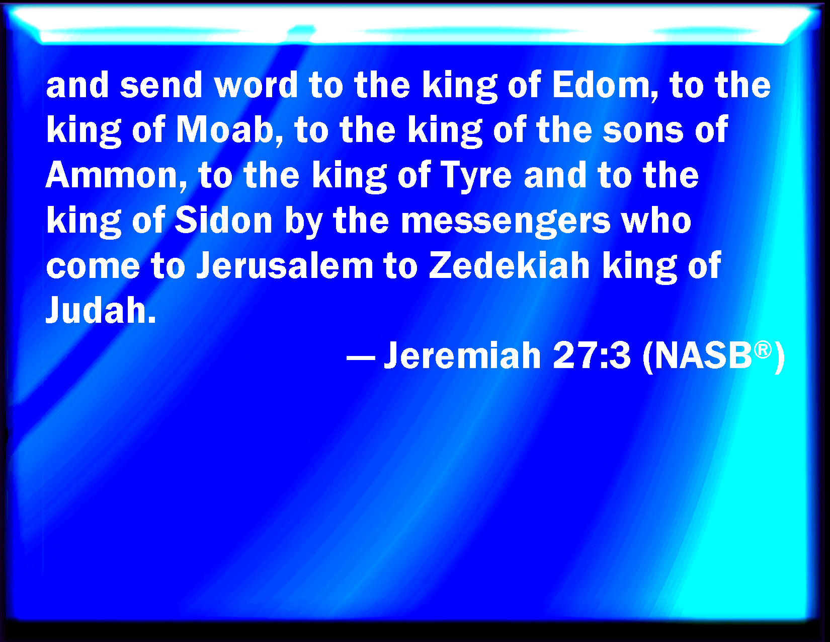 Bible Verse Slide Jeremiah 27:3 And send them to the king of Edom, and to the king of Moab, and to the king of the Ammonites, and to the king of Tyrus, and to the king of Zidon, by the hand of the messengers which come to Jerusalem to Zedekiah king of Judah; KJV: And send them to the king of Edom, and to the king of Moab, and to the king of the Ammonites, and to the king of Tyrus, and to the king of Zidon, by the hand of the messengers which come to Jerusalem unto Zedekiah king of Judah; DRB: And thou shalt send them to the of Edom, and to the king of Moab, and to the king of the children of Ammon, and to the king of Tyre, and to the king of Sidon: by the hand of the messengers that are come to Jerusalem to Sedecias the king of Juda. DBT: and send them to the king of Edom, and to the king of Moab, and to the king of the children of Ammon, and to the king of Tyre, and to the king of Zidon, by the hand of the messengers that come to Jerusalem unto Zedekiah king of Judah. ERV: and send them to the king of Edom, and to the king of Moab, and to the king of the children of Ammon, and to the king of Tyre, and to the king of Zidon, by the hand of the messengers which come to Jerusalem unto Zedekiah king of Judah; WBT: And send them to the king of Edom, and to the king of Moab, and to the king of the Ammonites, and to the king of Tyre, and to the king of Zidon, by the hand of the messengers who come to Jerusalem to Zedekiah king of Judah; WEB: and send them to the king of Edom, and to the king of Moab, and to the king of the children of Ammon, and to the king of Tyre, and to the king of Sidon, by the hand of the messengers who come to Jerusalem to Zedekiah king of Judah; YLT: And thou hast put them on thy neck, and hast sent them unto the king of Edom, and unto the king of Moab, and unto the king of the sons of Ammon, and unto the king of Tyre, and unto the king of Zidon, by the hand of messengers who are coming in to Jerusalem, unto Zedekiah king of Judah;Links Jeremiah 27:3 NIV • Jeremiah 27:3 NLT • Jeremiah 27:3 ESV • Jeremiah 27:3 NASB • Jeremiah 27:3 KJV • Jeremiah 27:3 Interlinear • Jeremiah 27:3 Commentaries • Jeremiah 27:3 Parallel Texts • Jeremiah 27:3 Bible Apps • Jeremiah 27:3 Parallel • Bible Hub |