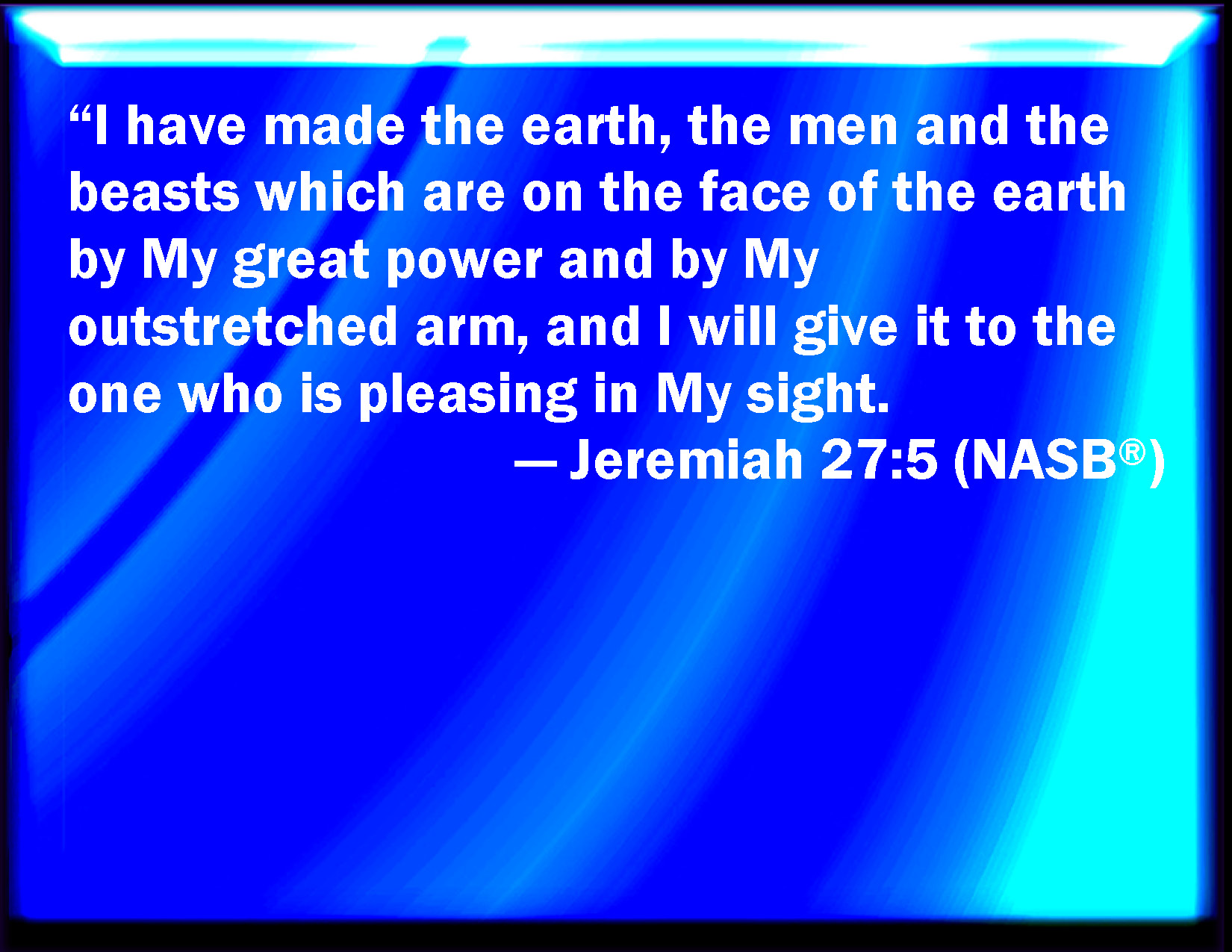 Bible Verse Slide Jeremiah 27:5 I have made the earth, the man and the beast that are on the ground, by my great power and by my outstretched arm, and have given it to whom it seemed meet to me. KJV: I have made the earth, the man and the beast that are upon the ground, by my great power and by my outstretched arm, and have given it unto whom it seemed meet unto me. DRB: I made the earth, and the men, and the beasts that are upon the face of the earth, by my great power, and by my stretched out arm: and I have given it to whom it seemed good in my eyes. DBT: I have made the earth, man and beast that are upon the face of the earth, by my great power and by my outstretched arm; and I give them unto whom it seemeth right in mine eyes. ERV: I have made the earth, the man and the beast that are upon the face of the earth, by my great power and by my outstretched arm; and I give it unto whom it seemeth right unto me. WBT: I have made the earth, the man and the beast that are upon the ground, by my great power and by my out-stretched arm, and have given it to whom it seemed meet to me. WEB: I have made the earth, the men and the animals that are on the surface of the earth, by my great power and by my outstretched arm; and I give it to whom it seems right to me. YLT: Thus do ye say unto your lords, I — I have made the earth with man, and the cattle that are on the face of the earth, by My great power, and by My stretched-out arm, and I have given it to whom it hath been right in Mine eyes.Links Jeremiah 27:5 NIV • Jeremiah 27:5 NLT • Jeremiah 27:5 ESV • Jeremiah 27:5 NASB • Jeremiah 27:5 KJV • Jeremiah 27:5 Interlinear • Jeremiah 27:5 Commentaries • Jeremiah 27:5 Parallel Texts • Jeremiah 27:5 Bible Apps • Jeremiah 27:5 Parallel • Bible Hub |