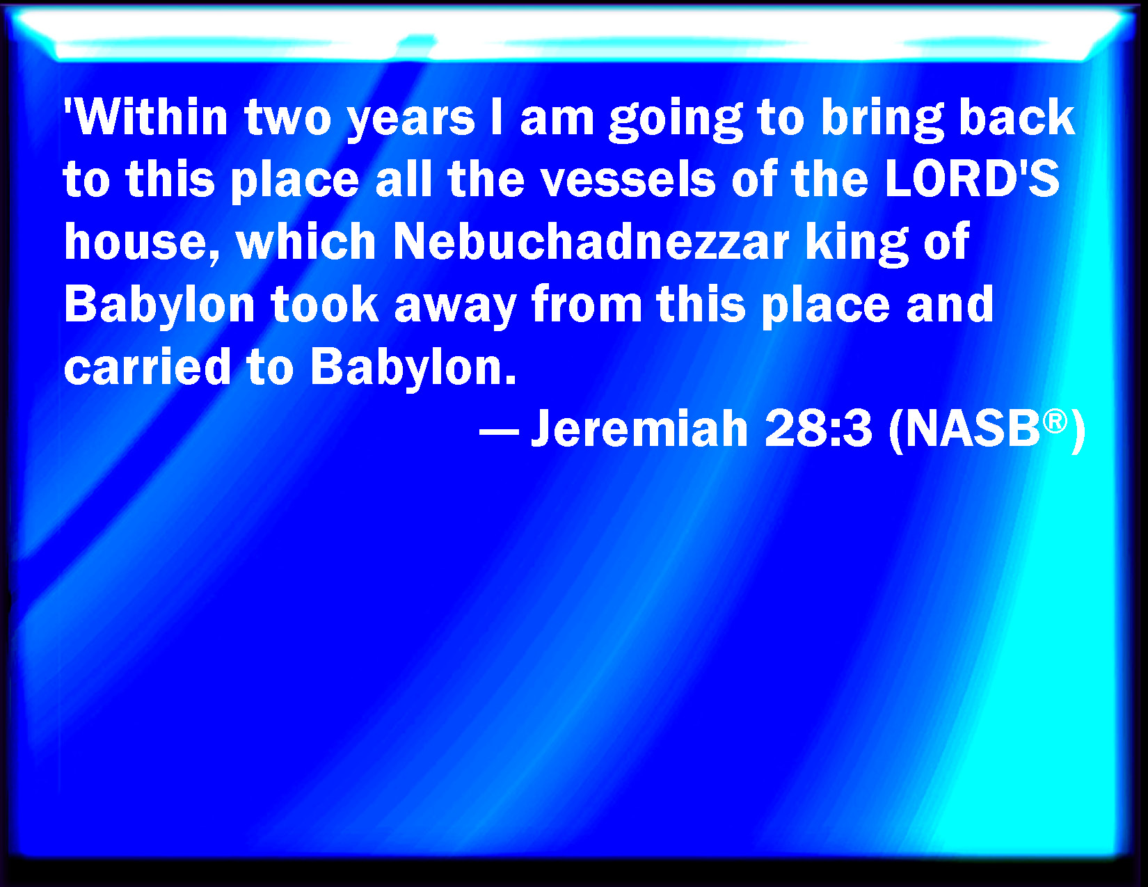 Bible Verse Slide Jeremiah 28:3 Within two full years will I bring again into this place all the vessels of the LORD's house, that Nebuchadnezzar king of Babylon took away from this place, and carried them to Babylon: KJV: Within two full years will I bring again into this place all the vessels of the LORD'S house, that Nebuchadnezzar king of Babylon took away from this place, and carried them to Babylon: DRB: As yet two years of days, and I will cause all the vessels of the house of the Lord to be brought back into this place, which Nabuchodonosor king of Babylon took away from this place, and carried them to Babylon. DBT: Within two full years will I bring again into this place all the vessels of Jehovah's house, that Nebuchadnezzar king of Babylon took away from this place, and carried to Babylon; ERV: Within two full years will I bring again into this place all the vessels of the LORD'S house, that Nebuchadnezzar king of Babylon took away from this place, and carried them to Babylon: WBT: Within two full years will I bring again into this place all the vessels of the LORD'S house, that Nebuchadnezzar king of Babylon took away from this place, and carried them to Babylon: WEB: Within two full years will I bring again into this place all the vessels of Yahweh's house, that Nebuchadnezzar king of Babylon took away from this place, and carried to Babylon: YLT: Within two years of days I am bringing back unto this place all the vessels of the house of Jehovah that Nebuchadnezzar king of Babylon hath taken from this place, and doth carry to Babylon,Links Jeremiah 28:3 NIV • Jeremiah 28:3 NLT • Jeremiah 28:3 ESV • Jeremiah 28:3 NASB • Jeremiah 28:3 KJV • Jeremiah 28:3 Interlinear • Jeremiah 28:3 Commentaries • Jeremiah 28:3 Parallel Texts • Jeremiah 28:3 Bible Apps • Jeremiah 28:3 Parallel • Bible Hub |