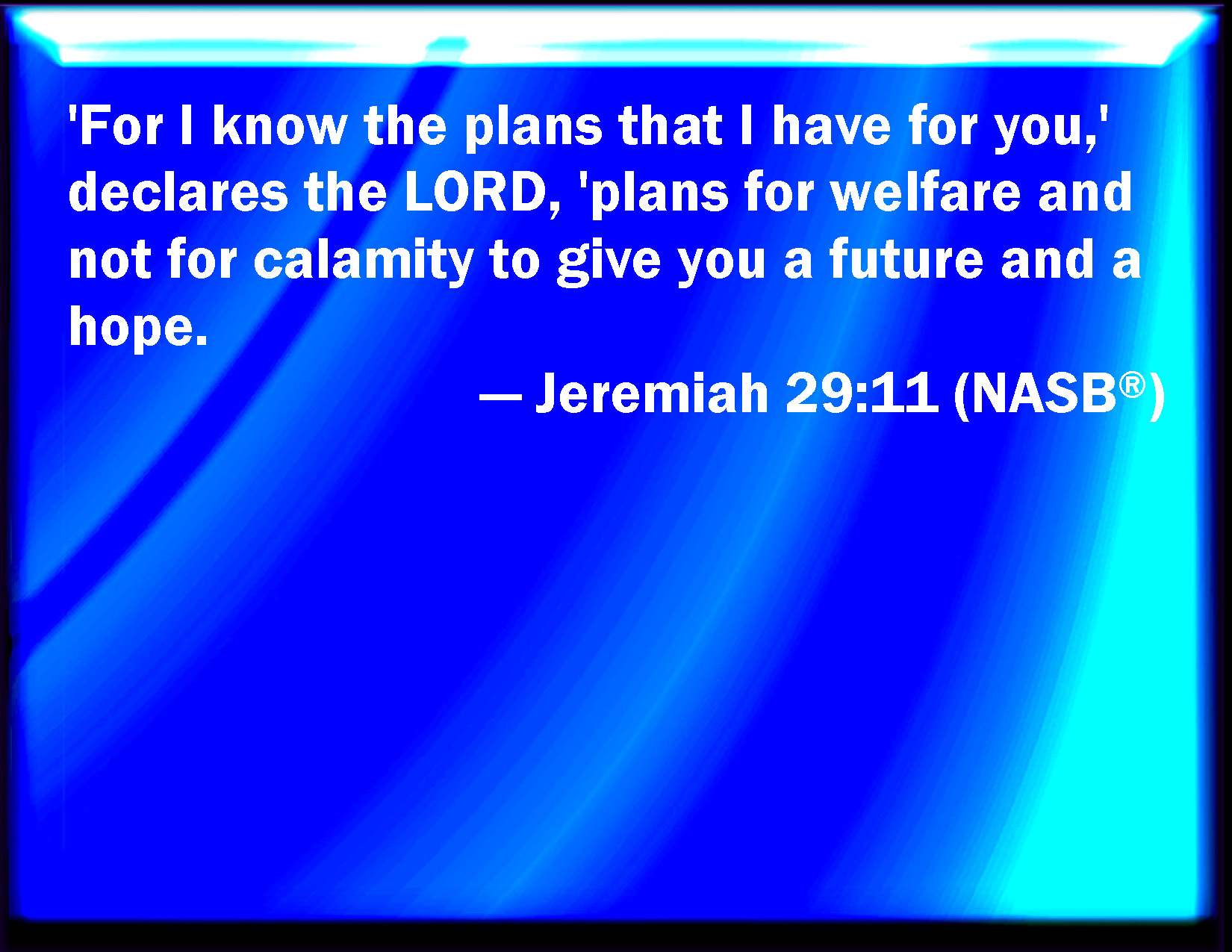 Bible Verse Slide Jeremiah 29:11 For I know the thoughts that I think toward you, said the LORD, thoughts of peace, and not of evil, to give you an expected end. KJV: For I know the thoughts that I think toward you, saith the LORD, thoughts of peace, and not of evil, to give you an expected end. DRB: For I know the thoughts that I think towards you, saith the Lord, thoughts of peace, and not of affliction, to give you an end and patience. DBT: For I know the thoughts that I think toward you, saith Jehovah, thoughts of peace, and not of evil, to give you in your latter end a hope. ERV: For I know the thoughts that I think toward you, saith the LORD, thoughts of peace, and not of evil, to give you hope in your latter end. WBT: For I know the thoughts that I think towards you, saith the LORD, thoughts of peace, and not of evil, to give you an expected end. WEB: For I know the thoughts that I think toward you, says Yahweh, thoughts of peace, and not of evil, to give you hope and a future. YLT: For I have known the thoughts that I am thinking towards you — an affirmation of Jehovah; thoughts of peace, and not of evil, to give to you posterity and hope.Links Jeremiah 29:11 NIV • Jeremiah 29:11 NLT • Jeremiah 29:11 ESV • Jeremiah 29:11 NASB • Jeremiah 29:11 KJV • Jeremiah 29:11 Interlinear • Jeremiah 29:11 Commentaries • Jeremiah 29:11 Parallel Texts • Jeremiah 29:11 Bible Apps • Jeremiah 29:11 Parallel • Bible Hub |