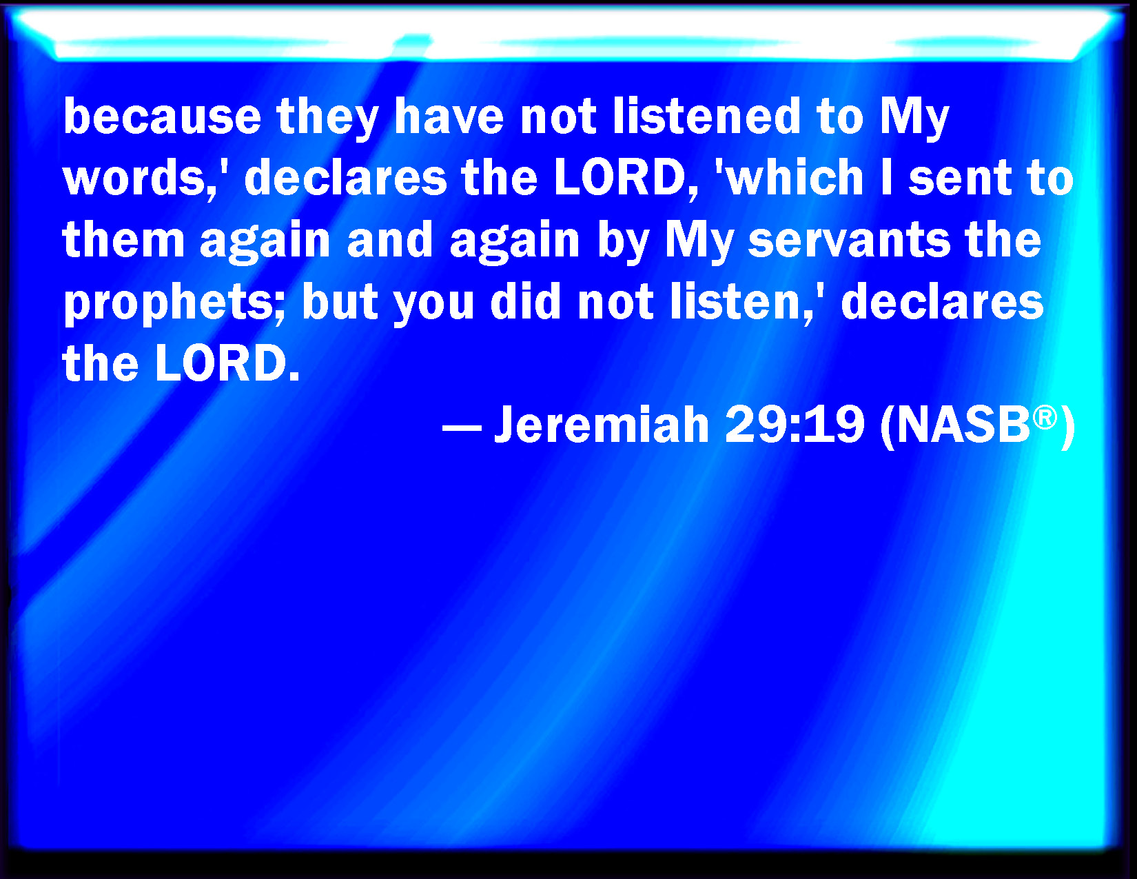 Bible Verse Slide Jeremiah 29:19 Because they have not listened to my words, said the LORD, which I sent to them by my servants the prophets, rising up early and sending them; but you would not hear, said the LORD. KJV: Because they have not hearkened to my words, saith the LORD, which I sent unto them by my servants the prophets, rising up early and sending them; but ye would not hear, saith the LORD. DRB: Because they have not hearkened to my words, saith the Lord: which I sent to them by my servants the prophets, rising by night, and sending: and you have not heard, saith the Lord. DBT: because they have not hearkened to my words, saith Jehovah, wherewith I sent unto them my servants the prophets, rising early and sending; but ye have not hearkened, saith Jehovah. ERV: because they have not hearkened to my words, saith the LORD, wherewith I sent unto them my servants the prophets, rising up early and sending them; but ye would not hear, saith the LORD. WBT: Because they have not hearkened to my words, saith the LORD, which I sent to them by my servants the prophets, rising early and sending them; but ye would not hear, saith the LORD. WEB: because they have not listened to my words, says Yahweh, with which I sent to them my servants the prophets, rising up early and sending them; but you would not hear, says Yahweh. YLT: Because that they have not hearkened unto My words — an affirmation of Jehovah — that I sent unto them by My servants the prophets, rising early and sending, and ye hearkened not — an affirmation of Jehovah.Links Jeremiah 29:19 NIV • Jeremiah 29:19 NLT • Jeremiah 29:19 ESV • Jeremiah 29:19 NASB • Jeremiah 29:19 KJV • Jeremiah 29:19 Interlinear • Jeremiah 29:19 Commentaries • Jeremiah 29:19 Parallel Texts • Jeremiah 29:19 Bible Apps • Jeremiah 29:19 Parallel • Bible Hub |