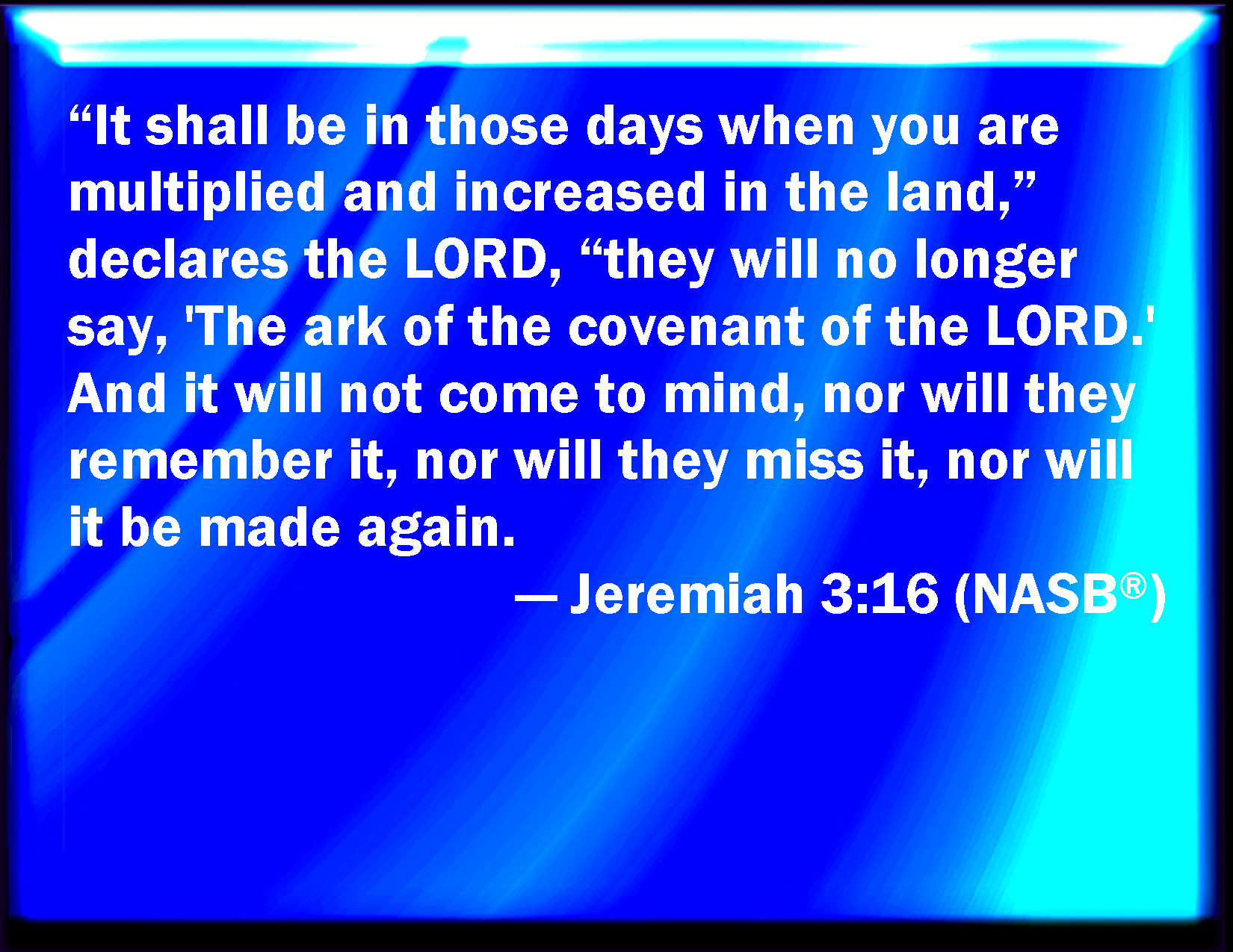 Bible Verse Slide Jeremiah 3:16 And it shall come to pass, when you be multiplied and increased in the land, in those days, said the LORD, they shall say no more, The ark of the covenant of the LORD: neither shall it come to mind: neither shall they remember it; neither shall they visit it; neither shall that be done any more. KJV: And it shall come to pass, when ye be multiplied and increased in the land, in those days, saith the LORD, they shall say no more, The ark of the covenant of the LORD: neither shall it come to mind: neither shall they remember it; neither shall they visit it; neither shall that be done any more. DRB: And when you shall be multiplied, and increase in the land in those days, saith the Lord, they shall say no more: The ark of the covenant of the Lord: neither shall it come upon the heart, neither shall they remember it, neither shall it be visited, neither shall that be done any more. DBT: And it shall come to pass, when ye are multiplied in the land and become fruitful, in those days, saith Jehovah, they shall say no more, Ark of the covenant of Jehovah! neither shall it come to mind, nor shall they remember it, nor shall they visit it; neither shall it be done any more. ERV: And it shall come to pass, when ye be multiplied and increased in the land, in those days, saith the LORD, they shall say no more, The ark of the covenant of the LORD; neither shall it come to mind: neither shall they remember it; neither shall they visit it; neither shall that be done any more. WBT: And it shall come to pass, when ye shall be multiplied and increased in the land, in those days, saith the LORD, they shall say no more, The ark of the covenant of the LORD: neither shall it come to mind: neither shall they remember it; neither shall they visit it; neither shall that be done any more. WEB: It shall come to pass, when you are multiplied and increased in the land, in those days," says Yahweh, "they shall say no more, 'The ark of the covenant of Yahweh!' neither shall it come to mind; neither shall they remember it; neither shall they miss it; neither shall it be made any more. YLT: And it hath come to pass, when ye are multiplied, And have been fruitful in the land, In those days — an affirmation of Jehovah, They say not any more, 'The ark of the covenant of Jehovah,' Nor doth it go up on the heart, Nor do they remember concerning it, Nor do they inspect, nor is it made again.Links Jeremiah 3:16 NIV • Jeremiah 3:16 NLT • Jeremiah 3:16 ESV • Jeremiah 3:16 NASB • Jeremiah 3:16 KJV • Jeremiah 3:16 Interlinear • Jeremiah 3:16 Commentaries • Jeremiah 3:16 Parallel Texts • Jeremiah 3:16 Bible Apps • Jeremiah 3:16 Parallel • Bible Hub |