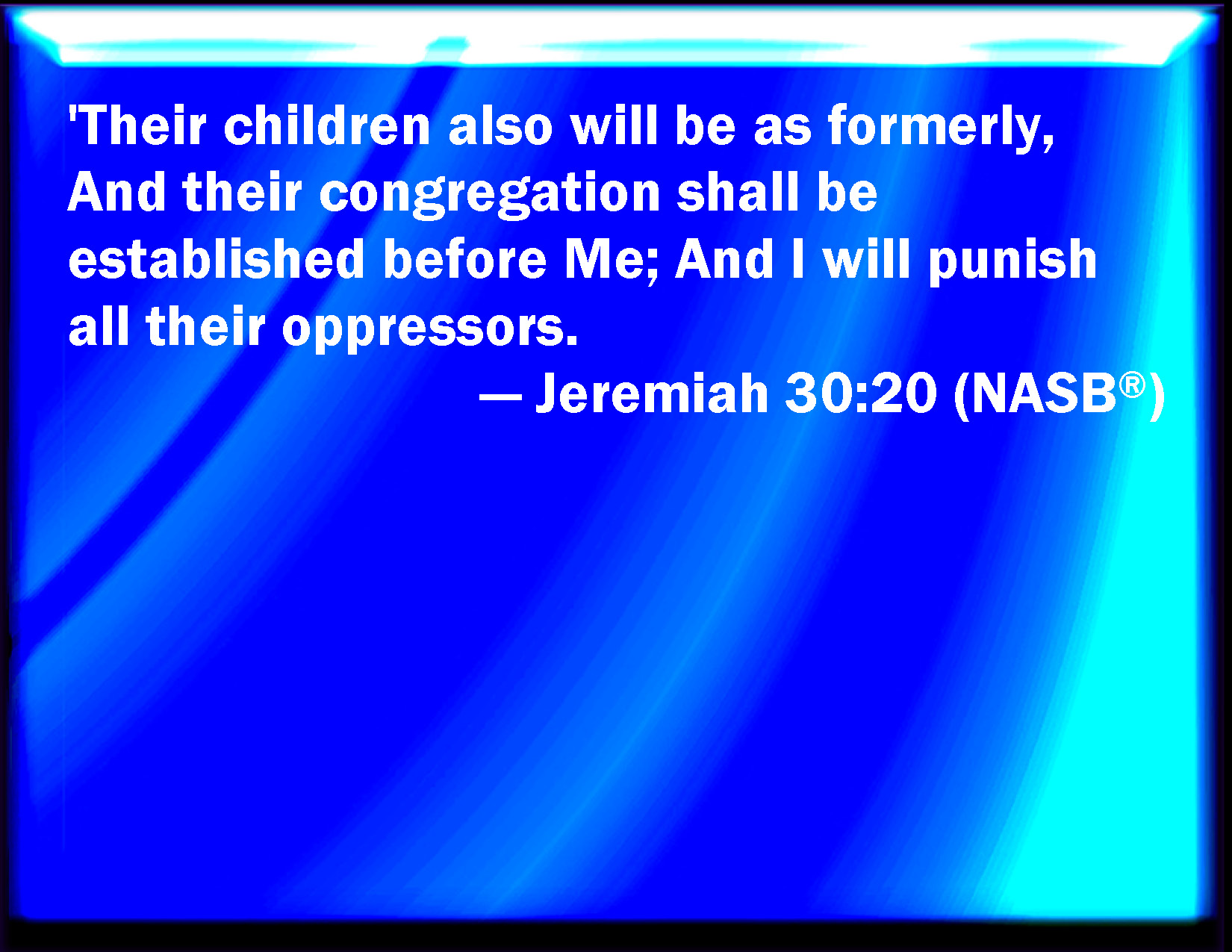 Bible Verse Slide Jeremiah 30:20 Their children also shall be as aforetime, and their congregation shall be established before me, and I will punish all that oppress them. KJV: Their children also shall be as aforetime, and their congregation shall be established before me, and I will punish all that oppress them. DRB: And their children shall be as from the beginning, and their assembly be permanent before me : and I will against all that afflict them. DBT: And their sons shall be as aforetime; and their assembly shall be established before me; and I will punish all that oppress them. ERV: Their children also shall be as aforetime, and their congregation shall be established before me, and I will punish all that oppress them. WBT: Their children also shall be as in former time, and their congregation shall be established before me, and I will punish all that oppress them. WEB: Their children also shall be as before, and their congregation shall be established before me; and I will punish all who oppress them. YLT: And his sons have been as aforetime, And his company before Me is established, And I have seen after all his oppressors.Links Jeremiah 30:20 NIV • Jeremiah 30:20 NLT • Jeremiah 30:20 ESV • Jeremiah 30:20 NASB • Jeremiah 30:20 KJV • Jeremiah 30:20 Interlinear • Jeremiah 30:20 Commentaries • Jeremiah 30:20 Parallel Texts • Jeremiah 30:20 Bible Apps • Jeremiah 30:20 Parallel • Bible Hub |