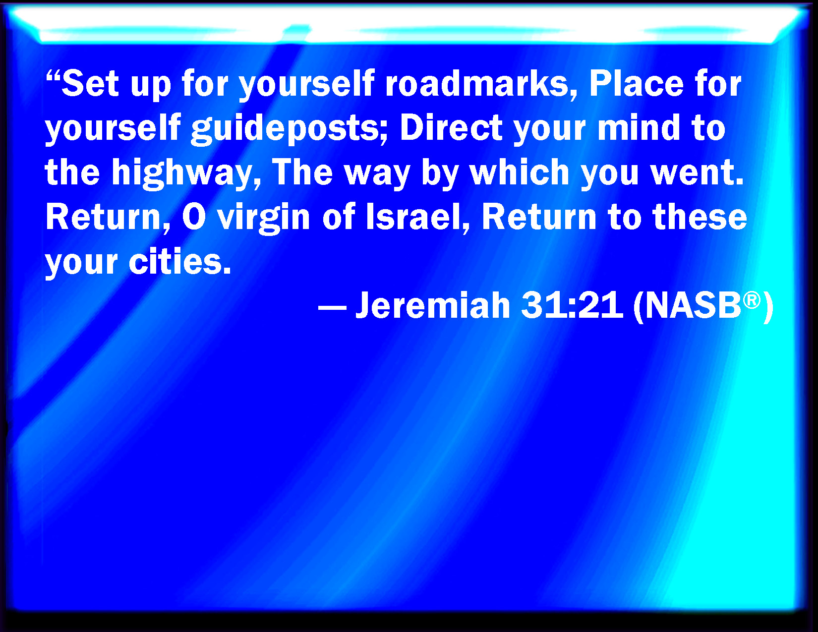 Bible Verse Slide Jeremiah 31:21 Set you up markers, make you high heaps: set your heart toward the highway, even the way which you went: turn again, O virgin of Israel, turn again to these your cities. KJV: Set thee up waymarks, make thee high heaps: set thine heart toward the highway, even the way which thou wentest: turn again, O virgin of Israel, turn again to these thy cities. DRB: Set thee up a watchtower, make to thee bitterness: direct thy heart into the right way, wherein thou hast walked: return, O virgin of Israel, return to these thy cities. DBT: Set up waymarks, make for thyself signposts; set thy heart toward the highway, the way by which thou wentest: turn again, O virgin of Israel, turn again to these thy cities. ERV: Set thee up waymarks, make thee guide-posts: set thine heart toward the highway, even the way by which thou wentest: turn again, O virgin of Israel, turn again to these thy cities. WBT: Set thee up way-marks, make thee high heaps: set thy heart towards the highway, even the way which thou wentest; turn again, O virgin of Israel, turn again to these thy cities. WEB: Set up road signs, make guideposts; set your heart toward the highway, even the way by which you went: turn again, virgin of Israel, turn again to these your cities. YLT: Set up for thee signs, make for thee heaps, Set thy heart to the highway, the way thou wentest, Turn back, O virgin of Israel, Turn back unto these thy cities.Links Jeremiah 31:21 NIV • Jeremiah 31:21 NLT • Jeremiah 31:21 ESV • Jeremiah 31:21 NASB • Jeremiah 31:21 KJV • Jeremiah 31:21 Interlinear • Jeremiah 31:21 Commentaries • Jeremiah 31:21 Parallel Texts • Jeremiah 31:21 Bible Apps • Jeremiah 31:21 Parallel • Bible Hub |