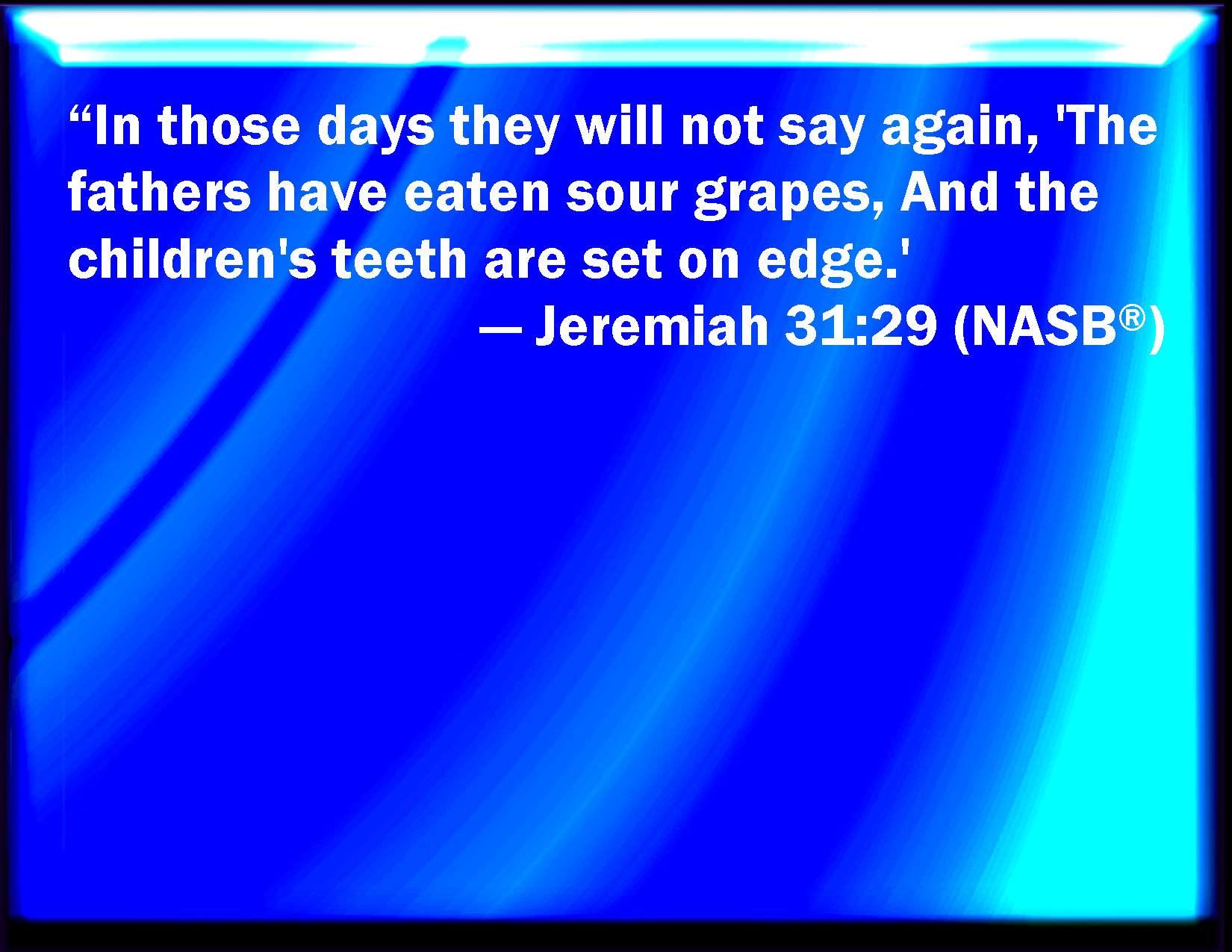 Bible Verse Slide Jeremiah 31:29 In those days they shall say no more, The fathers have eaten a sour grape, and the children's teeth are set on edge. KJV: In those days they shall say no more, The fathers have eaten a sour grape, and the children's teeth are set on edge. DRB: In those days they shall say no more: The fathers have eaten a sour grape, and the teeth of the children are set on edge. DBT: In those days they shall say no more, The fathers have eaten sour grapes, and the children's teeth are set on edge: ERV: In those days they shall say no more, The fathers have eaten sour grapes, and the children's teeth are set on edge. WBT: In those days they shall say no more, The fathers have eaten a sour grape, and the children's teeth are set on edge. WEB: In those days they shall say no more, The fathers have eaten sour grapes, and the children's teeth are set on edge. YLT: In those days they do not say any more: Fathers have eaten unripe fruit, And the sons' teeth are blunted.Links Jeremiah 31:29 NIV • Jeremiah 31:29 NLT • Jeremiah 31:29 ESV • Jeremiah 31:29 NASB • Jeremiah 31:29 KJV • Jeremiah 31:29 Interlinear • Jeremiah 31:29 Commentaries • Jeremiah 31:29 Parallel Texts • Jeremiah 31:29 Bible Apps • Jeremiah 31:29 Parallel • Bible Hub |