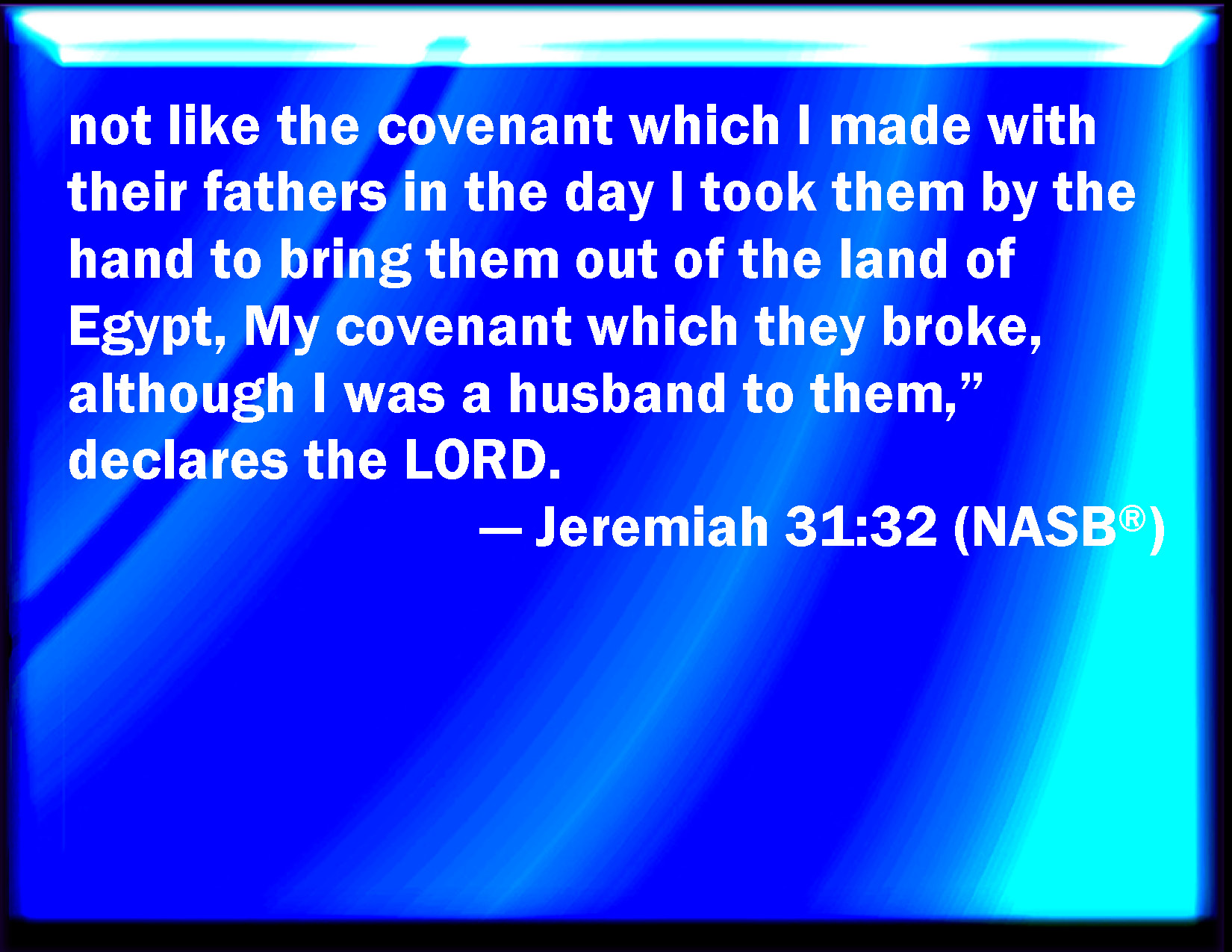 Bible Verse Slide Jeremiah 31:32 Not according to the covenant that I made with their fathers in the day that I took them by the hand to bring them out of the land of Egypt; which my covenant they broke, although I was an husband to them, said the LORD: KJV: Not according to the covenant that I made with their fathers in the day that I took them by the hand to bring them out of the land of Egypt; which my covenant they brake, although I was an husband unto them, saith the LORD: DRB: Not according to the covenant which I made with their fathers, in the day that I took them by the hand to bring them out of the land of Egypt: the covenant which they made void, and I had dominion over them, saith the Lord. DBT: not according to the covenant that I made with their fathers, in the day of my taking them by the hand, to lead them out of the land of Egypt; which my covenant they broke, although I was a husband unto them, saith Jehovah. ERV: not according to the covenant that I made with their fathers in the day that I took them by the hand to bring them out of the land of Egypt; which my covenant they brake, although I was an husband unto them, saith the LORD. WBT: Not according to the covenant that I made with their fathers in the day that I took them by the hand to bring them out of the land of Egypt; which my covenant they broke, although I was a husband to them, saith the LORD: WEB: not according to the covenant that I made with their fathers in the day that I took them by the hand to bring them out of the land of Egypt; which my covenant they broke, although I was a husband to them, says Yahweh. YLT: Not like the covenant that I made with their fathers, In the day of My laying hold on their hand, To bring them out of the land of Egypt, In that they made void My covenant, And I ruled over them — an affirmation of Jehovah.Links Jeremiah 31:32 NIV • Jeremiah 31:32 NLT • Jeremiah 31:32 ESV • Jeremiah 31:32 NASB • Jeremiah 31:32 KJV • Jeremiah 31:32 Interlinear • Jeremiah 31:32 Commentaries • Jeremiah 31:32 Parallel Texts • Jeremiah 31:32 Bible Apps • Jeremiah 31:32 Parallel • Bible Hub |