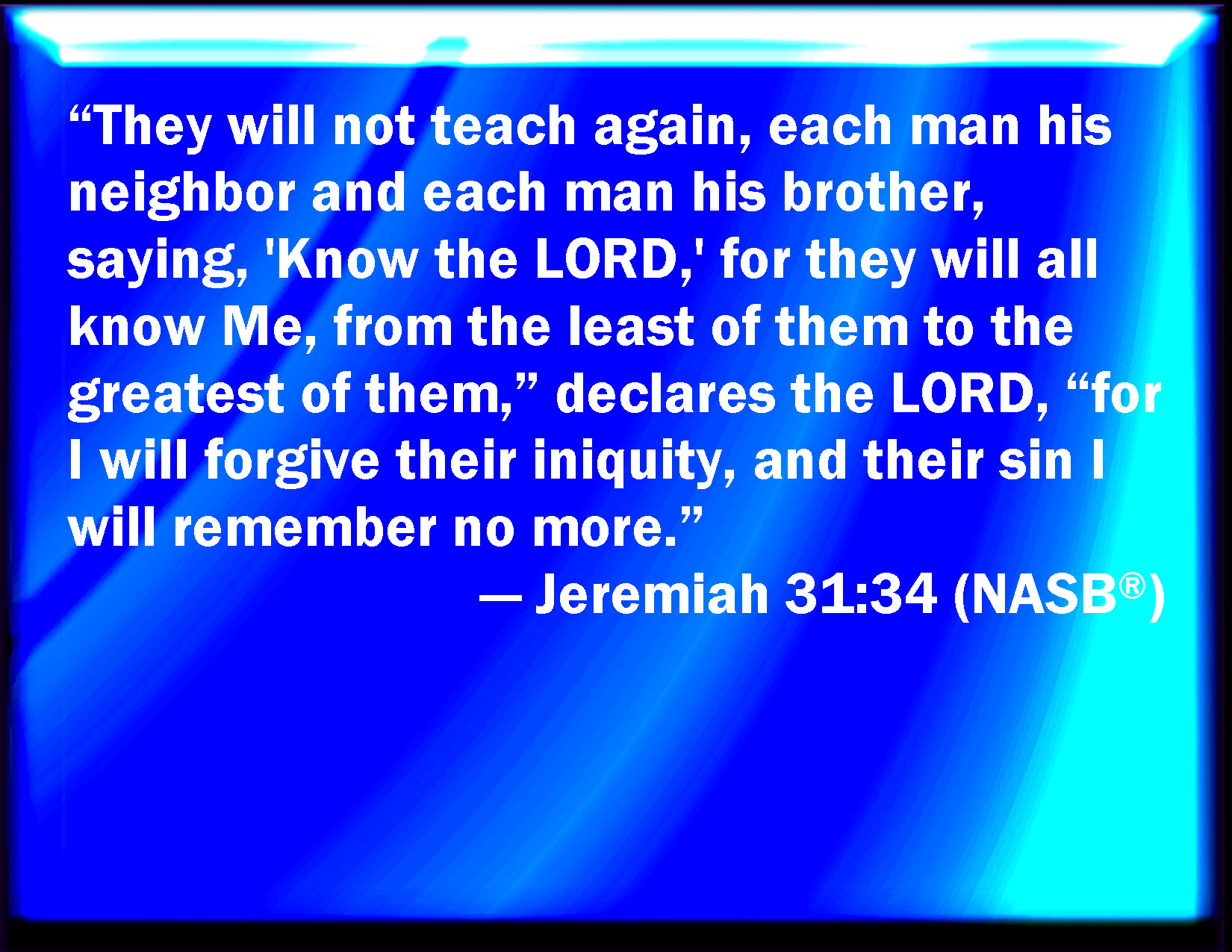 Bible Verse Slide Jeremiah 31:34 And they shall teach no more every man his neighbor, and every man his brother, saying, Know the LORD: for they shall all know me, from the least of them to the greatest of them, said the LORD: for I will forgive their iniquity, and I will remember their sin no more. KJV: And they shall teach no more every man his neighbour, and every man his brother, saying, Know the LORD: for they shall all know me, from the least of them unto the greatest of them, saith the LORD: for I will forgive their iniquity, and I will remember their sin no more. DRB: And they shall teach no more every man his neighbour, and every man his brother, saying: Know the Lord: for all shall know me from the least of them even to the greatest, saith the Lord: for I will forgive their iniquity, and I will remember their sin no more. DBT: And they shall teach no more every man his neighbour, and every man his brother, saying, Know Jehovah; for they shall all know me, from the least of them unto the greatest of them, saith Jehovah: for I will pardon their iniquity, and their sin will I remember no more. ERV: and they shall teach no more every man his neighbour, and every man his brother, saying, Know the LORD: for they shall all know me, from the least of them unto the greatest of them, saith the LORD: for I will forgive their iniquity, and their sin will I remember no more. WBT: And they shall teach no more every man his neighbor, and every man his brother, saying, Know the LORD: for they shall all know me, from the least of them to the greatest of them, saith the LORD: for I will forgive their iniquity, and I will remember their sin no more. WEB: and they shall teach no more every man his neighbor, and every man his brother, saying, Know Yahweh; for they shall all know me, from the least of them to the greatest of them, says Yahweh: for I will forgive their iniquity, and their sin will I remember no more. YLT: And they do not teach any more Each his neighbour, and each his brother, Saying, Know ye Jehovah, For they all know Me, from their least unto their greatest, An affirmation of Jehovah; For I pardon their iniquity, And of their sin I make mention no more.Links Jeremiah 31:34 NIV • Jeremiah 31:34 NLT • Jeremiah 31:34 ESV • Jeremiah 31:34 NASB • Jeremiah 31:34 KJV • Jeremiah 31:34 Interlinear • Jeremiah 31:34 Commentaries • Jeremiah 31:34 Parallel Texts • Jeremiah 31:34 Bible Apps • Jeremiah 31:34 Parallel • Bible Hub |