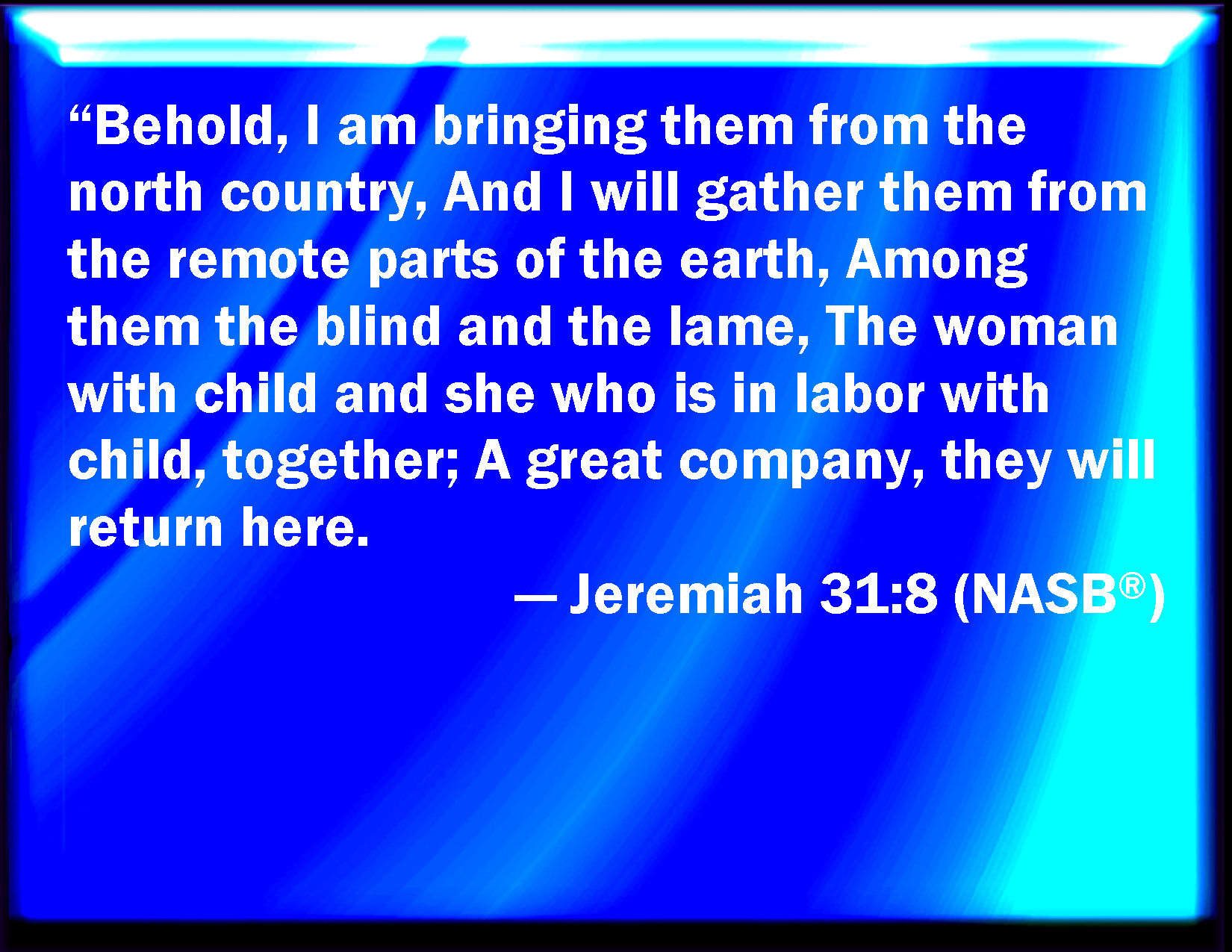 Bible Verse Slide Jeremiah 31:8 Behold, I will bring them from the north country, and gather them from the coasts of the earth, and with them the blind and the lame, the woman with child and her that travails with child together: a great company shall return thither. KJV: Behold, I will bring them from the north country, and gather them from the coasts of the earth, and with them the blind and the lame, the woman with child and her that travaileth with child together: a great company shall return thither. DRB: Behold I will bring them from the north country, and will gather them from the ends of the earth: and among them shall be the blind, and the lame, the woman with child, and she that is bringing forth, together, a great company of them returning hither. DBT: Behold, I bring them from the north country, and gather them from the uttermost parts of the earth; and among them the blind and the lame, the woman with child and her that travaileth with child together: a great assemblage shall they return hither. ERV: Behold, I will bring them from the north country, and gather them from the uttermost parts of the earth, and with them the blind and the lame, the woman with child and her that travaileth with child together: a great company shall they return hither. WBT: Behold, I will bring them from the north country, and gather them from the borders of the earth, and with them the blind and the lame, the woman with child and her that travaileth with child together: a great company shall return thither. WEB: Behold, I will bring them from the north country, and gather them from the uttermost parts of the earth, [and] with them the blind and the lame, the woman with child and her who travails with child together: a great company shall they return here. YLT: Lo, I am bringing them in from the north country, And have gathered them from the sides of the earth, Among them are blind and lame, Conceiving and travailing one — together, A great assembly — they turn back hither.Links Jeremiah 31:8 NIV • Jeremiah 31:8 NLT • Jeremiah 31:8 ESV • Jeremiah 31:8 NASB • Jeremiah 31:8 KJV • Jeremiah 31:8 Interlinear • Jeremiah 31:8 Commentaries • Jeremiah 31:8 Parallel Texts • Jeremiah 31:8 Bible Apps • Jeremiah 31:8 Parallel • Bible Hub |