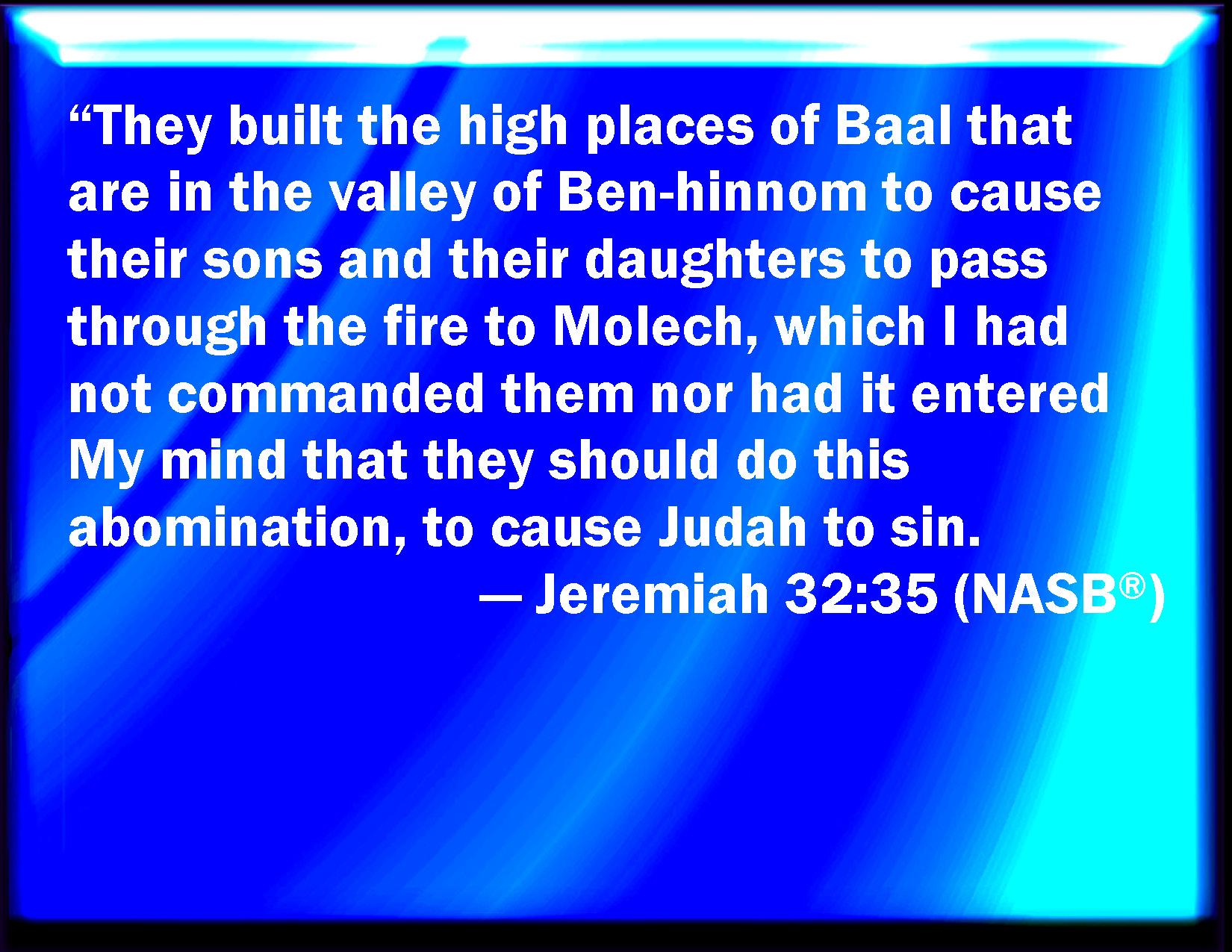 Bible Verse Slide Jeremiah 32:35 And they built the high places of Baal, which are in the valley of the son of Hinnom, to cause their sons and their daughters to pass through the fire to Molech; which I commanded them not, neither came it into my mind, that they should do this abomination, to cause Judah to sin. KJV: And they built the high places of Baal, which are in the valley of the son of Hinnom, to cause their sons and their daughters to pass through the fire unto Molech; which I commanded them not, neither came it into my mind, that they should do this abomination, to cause Judah to sin. DRB: And they have built the high places of Baal, which are in the valley of the son of Ennom, to consecrate their sons and their daughters to Moloch: which I commanded them not, neither entered it into my heart, that they should do this abomination, and cause Juda to sin. DBT: and they have built the high places of Baal, which are in the valley of the son of Hinnom, to cause to pass through the fire their sons and their daughters unto Molech: which I commanded them not, neither came it into my mind, that they should do this abomination, to cause Judah to sin. ERV: And they built the high places of Baal, which are in the valley of the son of Hinnom, to cause their sons and their daughters to pass through the fire unto Molech; which I commanded them not, neither came it into my mind, that they should do this abomination; to cause Judah to sin. WBT: And they built the high places of Baal, which are in the valley of the son of Hinnom, to cause their sons and their daughters to pass through the fire to Molech; which I commanded them not, neither came it into my mind, that they should do this abomination, to cause Judah to sin. WEB: They built the high places of Baal, which are in the valley of the son of Hinnom, to cause their sons and their daughters to pass through [the fire] to Molech; which I didn't command them, neither did it come into my mind, that they should do this abomination, to cause Judah to sin. YLT: And they build the high places of Baal, that are in the valley of the son of Hinnom, to cause their sons and their daughters to pass through to Molech, which I did not command them, nor did it come up on my heart to do this abomination, so as to cause Judah to sin.Links Jeremiah 32:35 NIV • Jeremiah 32:35 NLT • Jeremiah 32:35 ESV • Jeremiah 32:35 NASB • Jeremiah 32:35 KJV • Jeremiah 32:35 Interlinear • Jeremiah 32:35 Commentaries • Jeremiah 32:35 Parallel Texts • Jeremiah 32:35 Bible Apps • Jeremiah 32:35 Parallel • Bible Hub |